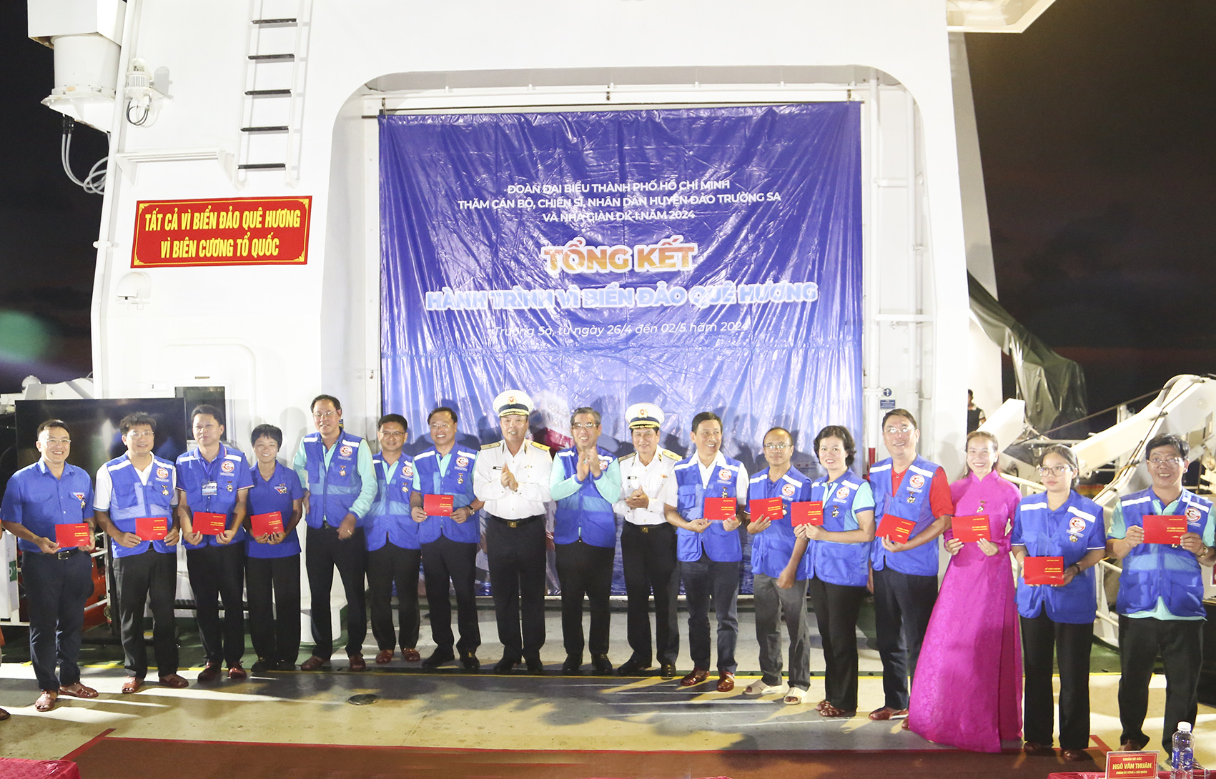 Nhân dịp này, Quân chủng Hải quân đã trao tặng các đại biểu tham gia đoàn công tác Kỷ niệm chương Vì sự nghiệp bảo vệ chủ quyền biển, đảo và huy hiệu Chiến sĩ Trường Sa. TP. Hồ Chí Minh và Ủy ban MTTQ Việt Nam TP. Hồ Chí Minh tặng Bằng khen các tập thể và cá nhân có thành tích xuất sắc trong thực hiện nhiệm vụ của chuyến đi.