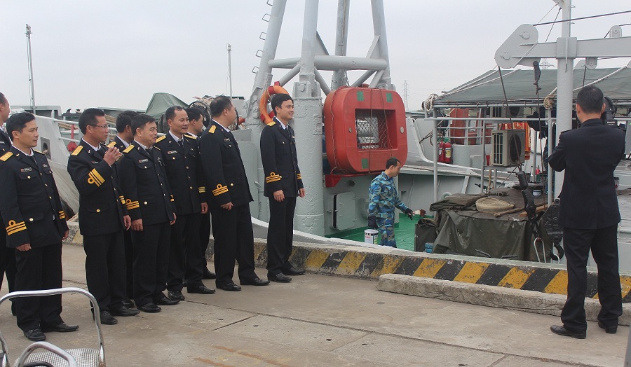 Các đồng chí học viên sau khi học lý thuyết tại hội trường đã tập ghi hình các hoạt động trên tàu của Hải đội 695, Đoàn Đo đạc biên vẽ hải đồ và nghiên cứu biển.