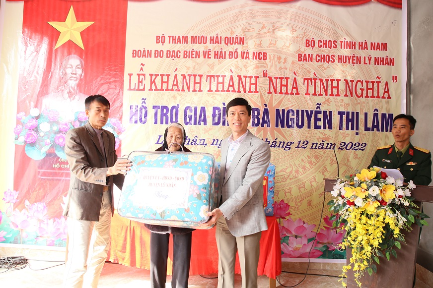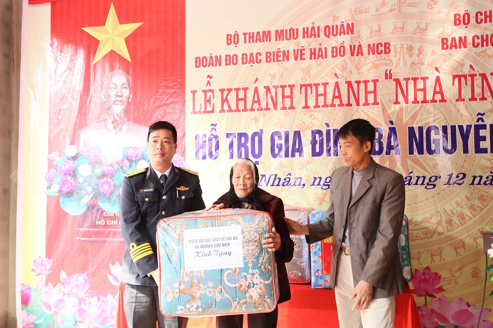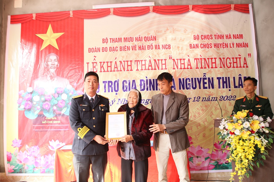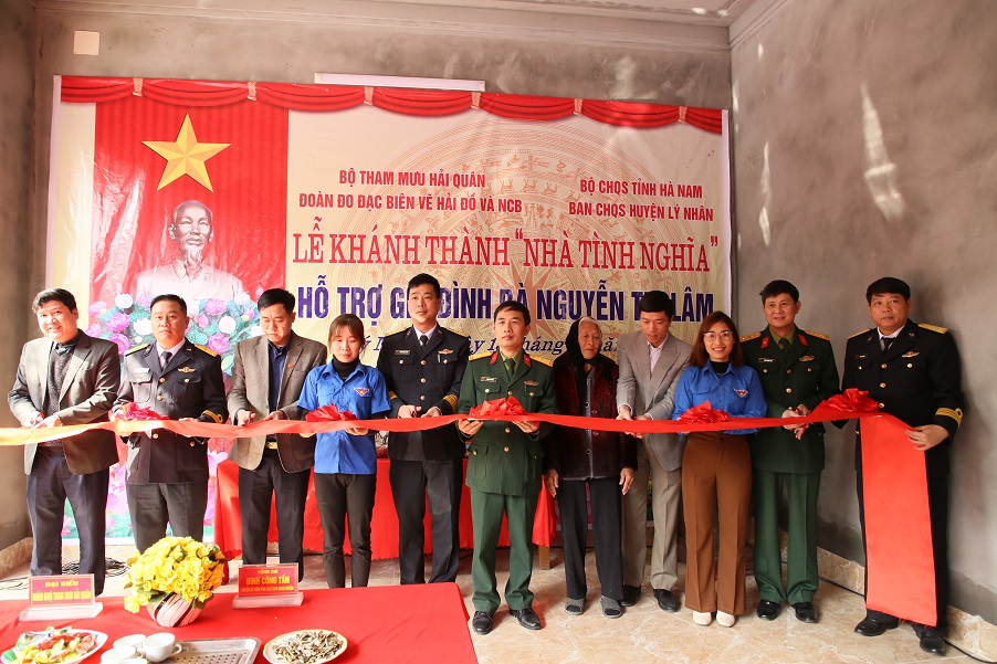 Sáng 13/12, tại thị trấn Vĩnh Trụ, huyện Lý Nhân, tỉnh Hà Nam, Đoàn Đo đạc biên vẽ hải đồ và nghiên cứu biển, Bộ Tham mưu Hải quân phối hợp với Ban Chỉ huy quân sự (CHQS) huyện Lý Nhân tổ chức Lễ khánh thành nhà tình nghĩa hỗ trợ gia đình bà Nguyễn Thị Lâm.