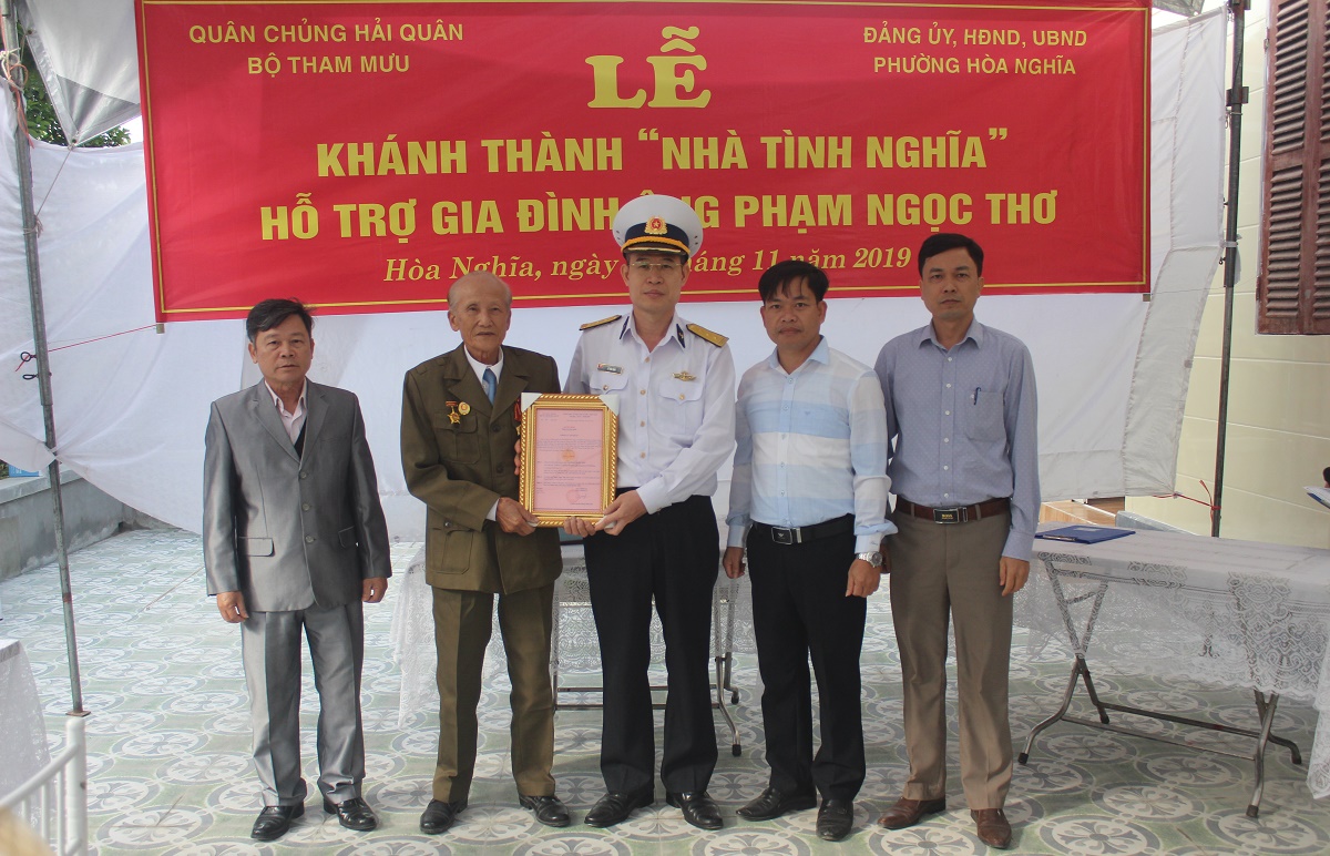 Sáng 29-11, tại tổ dân phố số 5, phường Hòa Nghĩa, quận Dương Kinh, TP. Hải Phòng, Đoàn Đo đạc biên vẽ hải đồ và nghiên cứu biển, Bộ Tham mưu Hải quân tổ chức khánh thành và bàn giao nhà tình nghĩa tặng gia đình ông Phạm Ngọc Thơ. Ông Thơ sinh năm 1935 là thương binh hạng ¾.