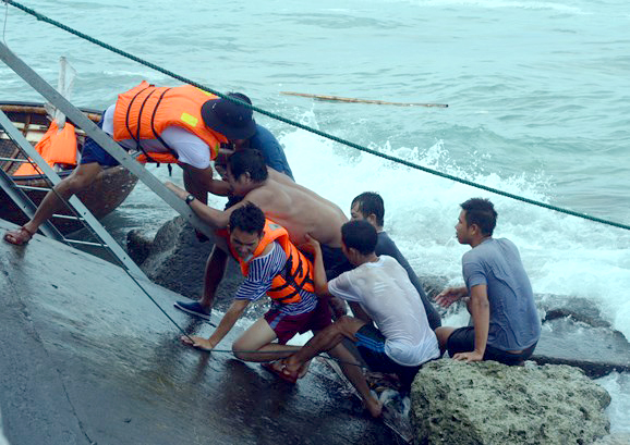 Cán bộ, chiến sĩ Hải quân đưa ngư dân vào đảo Song Tử Tây tránh bão. Ảnh: CTV