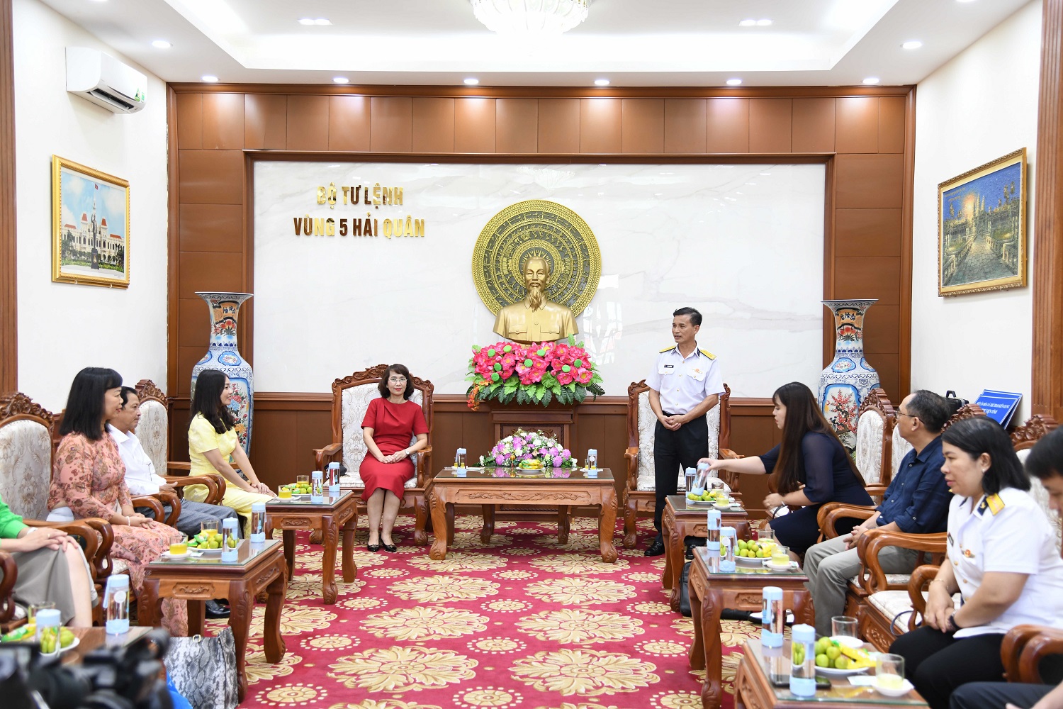 Sáng 2/8, tại TP. Phú Quốc, tỉnh Kiên Giang, đoàn tập huấn về chuyển đổi số trong lĩnh vực thư viện do đồng chí Kiều Thúy Nga, Vụ trưởng Vụ Thư viện, Bộ Văn hóa, Thể thao và Du lịch làm trưởng đoàn đã đến thăm, chào xã giao Bộ Tư lệnh Vùng 5 Hải quân. Đại tá Lê Văn Hưởng, Phó Chính ủy Vùng chủ trì tiếp đoàn.