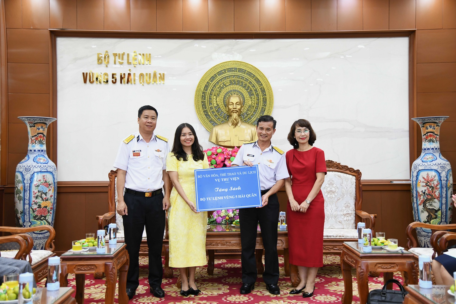 Ban lãnh đạo Vụ Thư viện trao biển biểu trưng tặng 200 cuốn sách cho cán bộ, chiến sĩ Bộ Tư lệnh Vùng 5