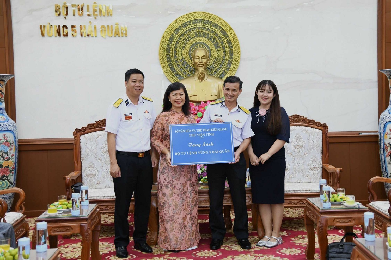 Dịp này, Vụ Thư viện và Thư viện tỉnh Kiên Giang đã trao tặng cán bộ, chiến sĩ Bộ Tư lệnh Vùng 5 Hải quân 800 cuốn sách với nhiều thể loại như: Chính trị - xã hội; sách văn hóa, văn học, lịch sử, pháp luật, nghiên cứu tham khảo…