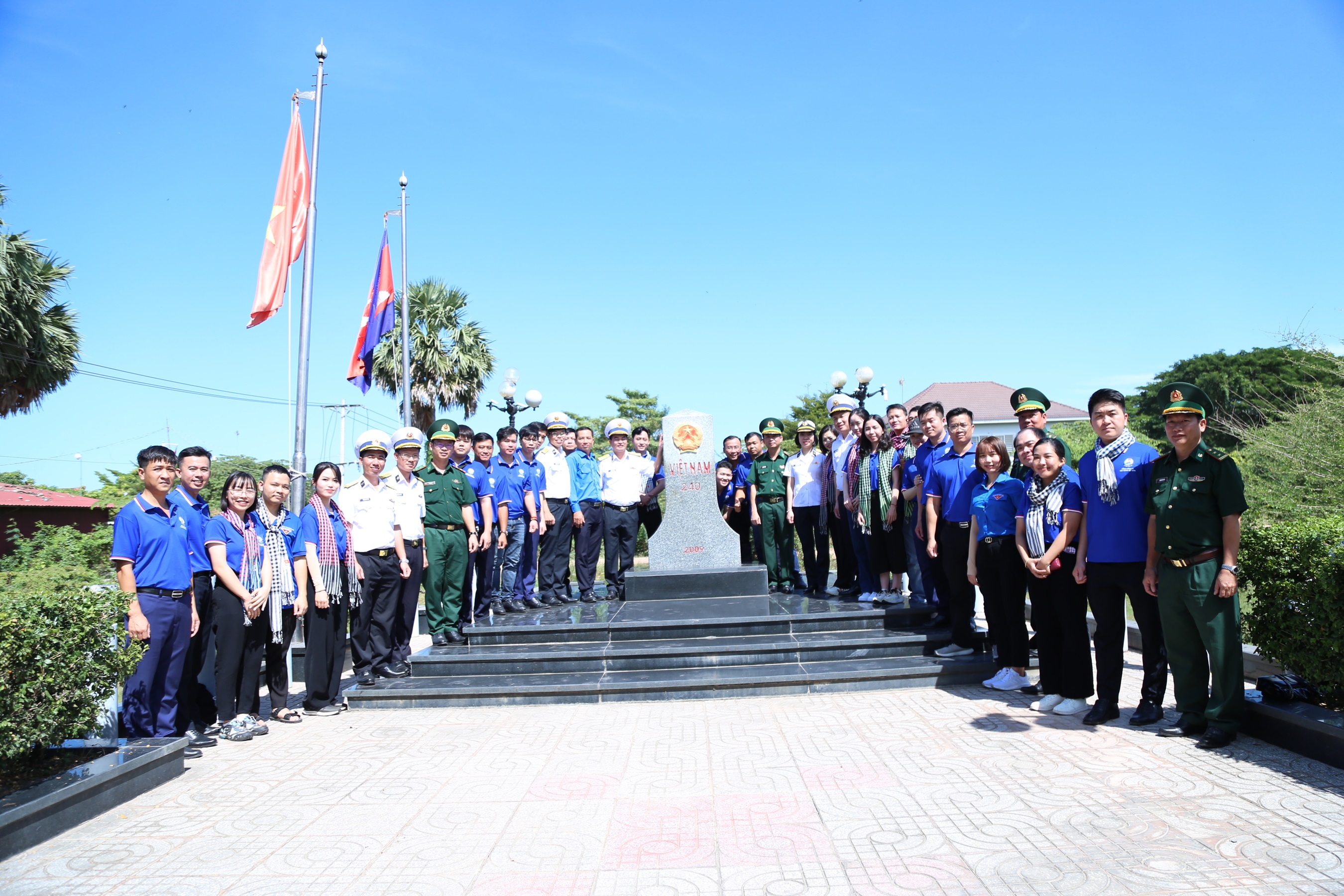 Đoàn công tác và cán bộ, chiến sĩ Đồn Biên phòng cửa khẩu quốc tế Thường Phước chụp ảnh lưu niệm tại cột mốc biên giới số 240 (Việt Nam - Cam-pu-chia)