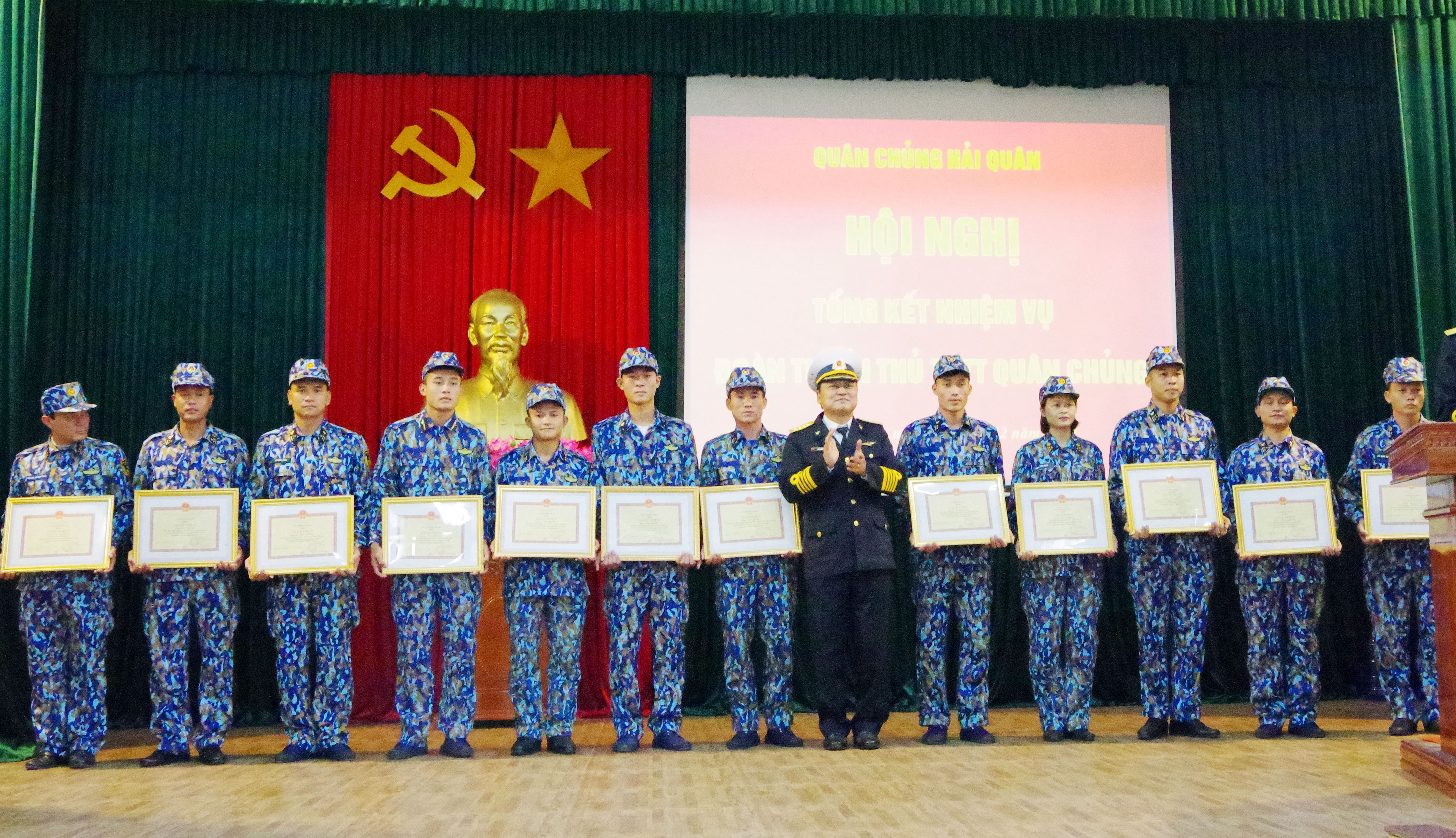 Đại tá Hoàng Quang Hà trao Bằng khen của Bộ Tư lệnh Hải quân cho đội tuyển môn quần vợt đã đạt thành tích xuất sắc tại hội thao
