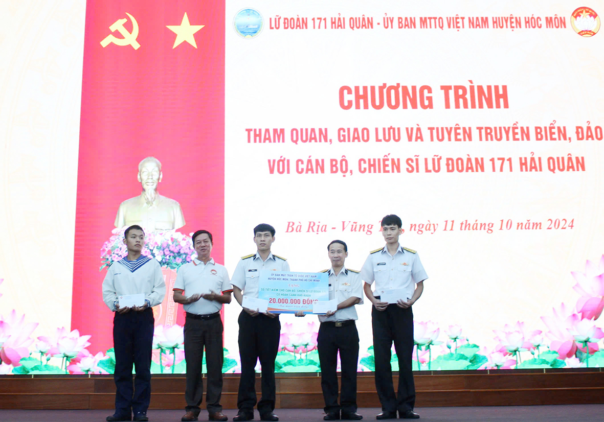 Sáng 11/10, tại TP. Vũng Tàu, tỉnh Bà Rịa - Vũng Tàu, đoàn công tác của Uỷ ban Mặt trận Tổ quốc (UBMTTQ) Việt Nam huyện Hóc Môn, TP. Hồ Chí Minh đã tới thăm, giao lưu với cán bộ, chiến sĩ Lữ đoàn 171, Vùng 2 Hải quân.