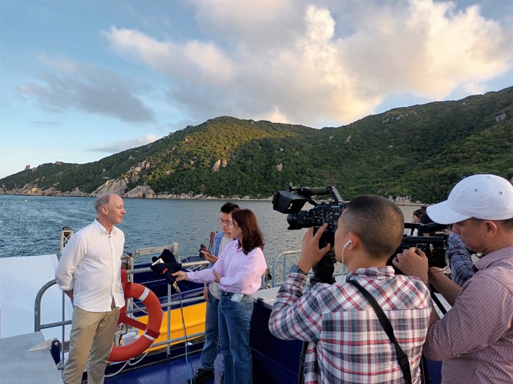 Các nhà báo tác nghiệp trên vùng biển tỉnh Khánh Hòa. Ảnh: Hải Luận