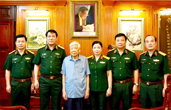 Đại tướng Lương Cường và cán bộ Cơ quan Tổng cục Chính trị chụp ảnh với nguyên Tổng Bí thư Lê Khả Phiêu. Ảnh: Quang Thắng