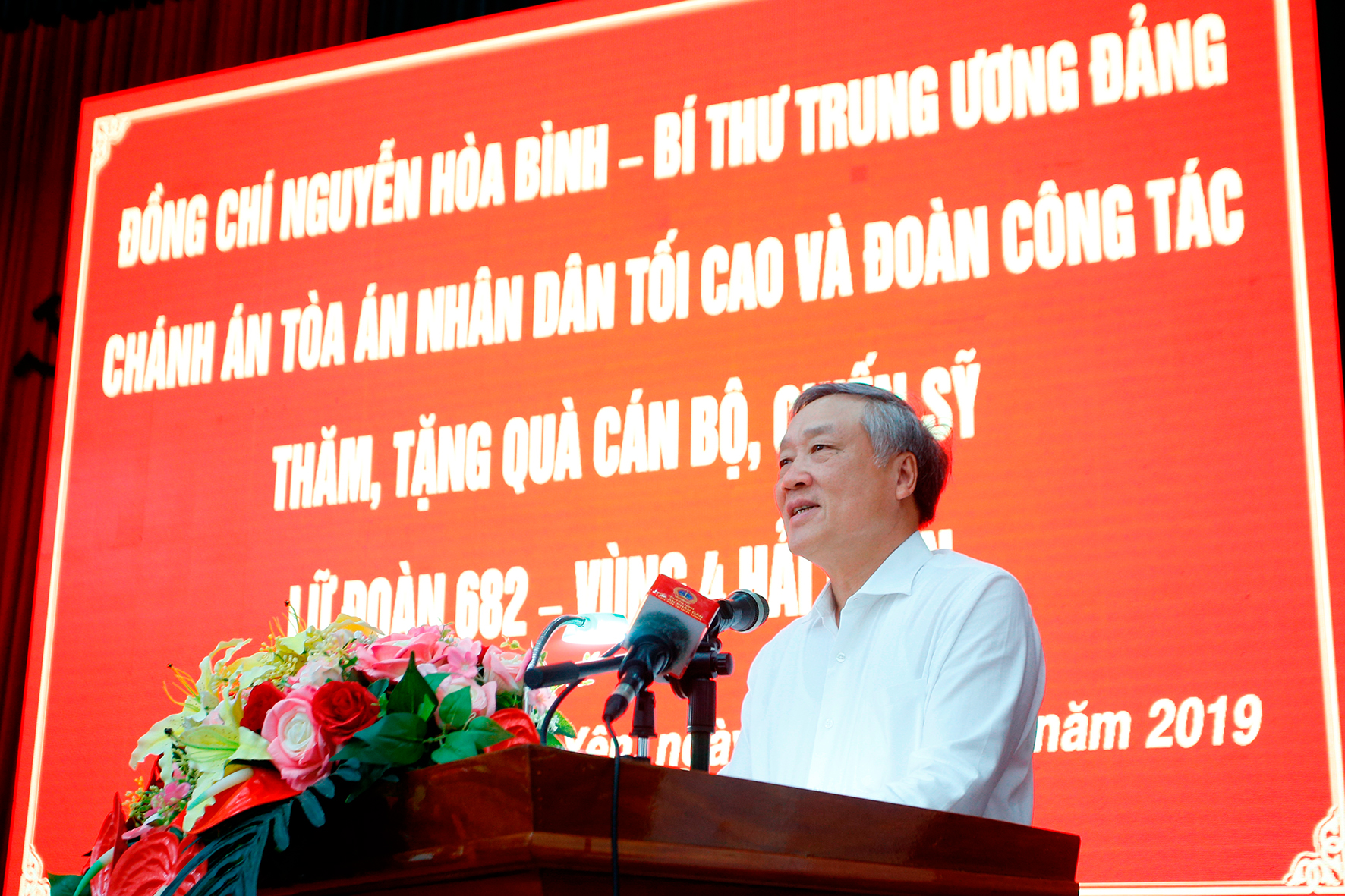 Sáng 30-11, tại TP. Tuy Hòa, tỉnh Phú Yên, đồng chí Nguyễn Hòa Bình, Bí thư Trung ương Đảng, Chánh án Tòa án Nhân dân tối cao cùng đoàn công tác Tòa án Nhân dân tối cao đã đến thăm, động viên và tặng quà cán bộ, chiến sĩ Lữ đoàn 682, Vùng 4 Hải quân.