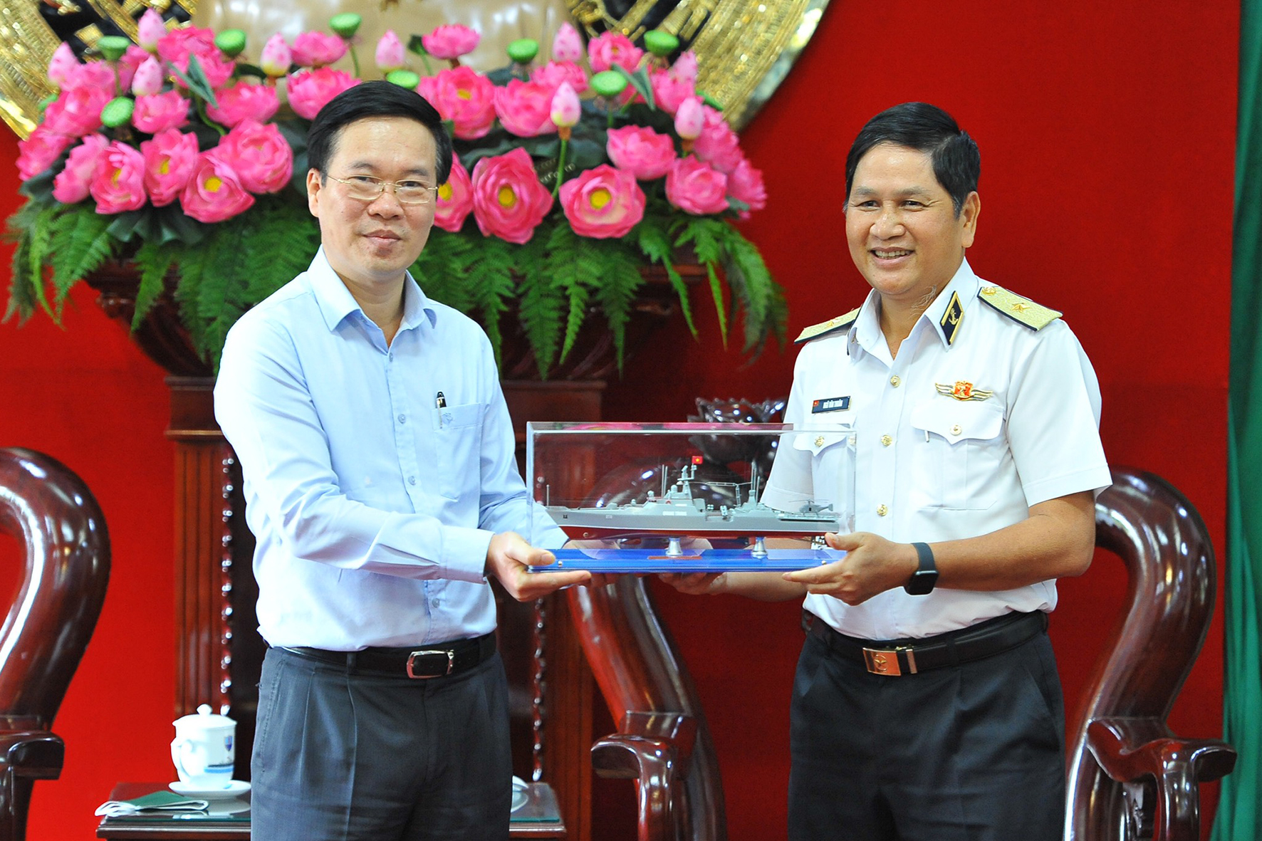 Chuẩn Đô đốc Ngô Văn Thuân tặng đồng chí Võ Văn Thưởng mô hình tàu chiến đấu