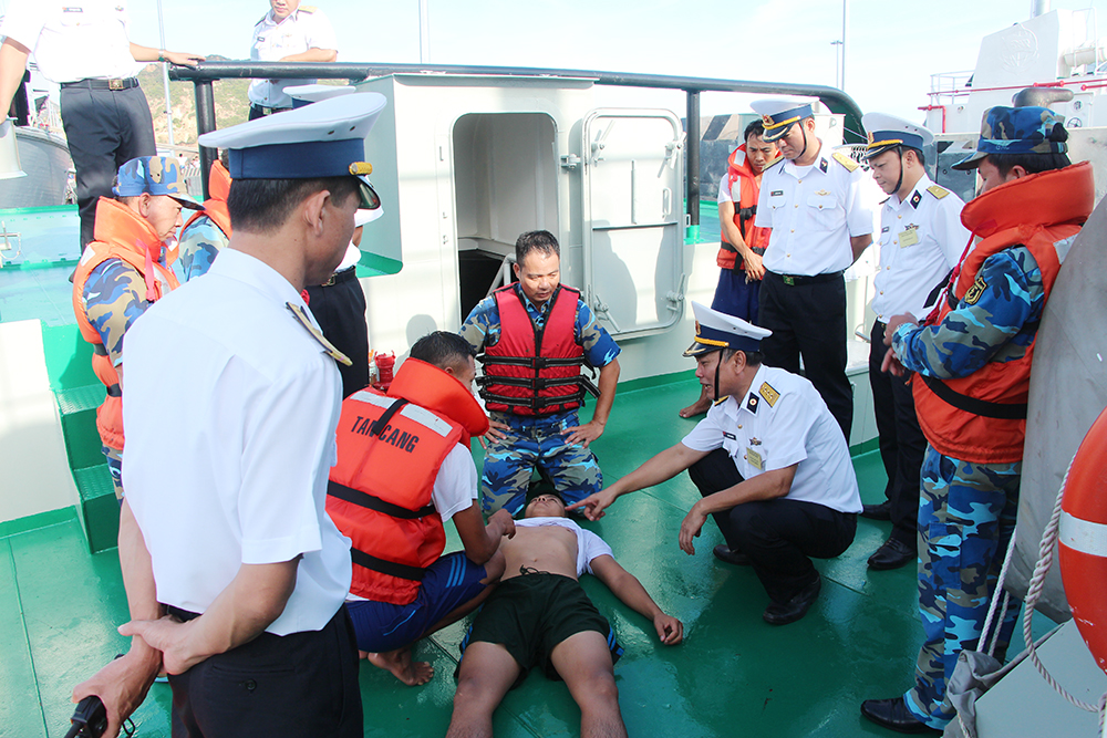 Thí sinh tham gia thi thực hành sơ cứu khi có người rơi xuống nước