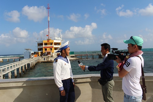 Phóng viên Đài Phát thanh - Truyền hình Bình Phước tác nghiệp tại Trường Sa. Ảnh: NV