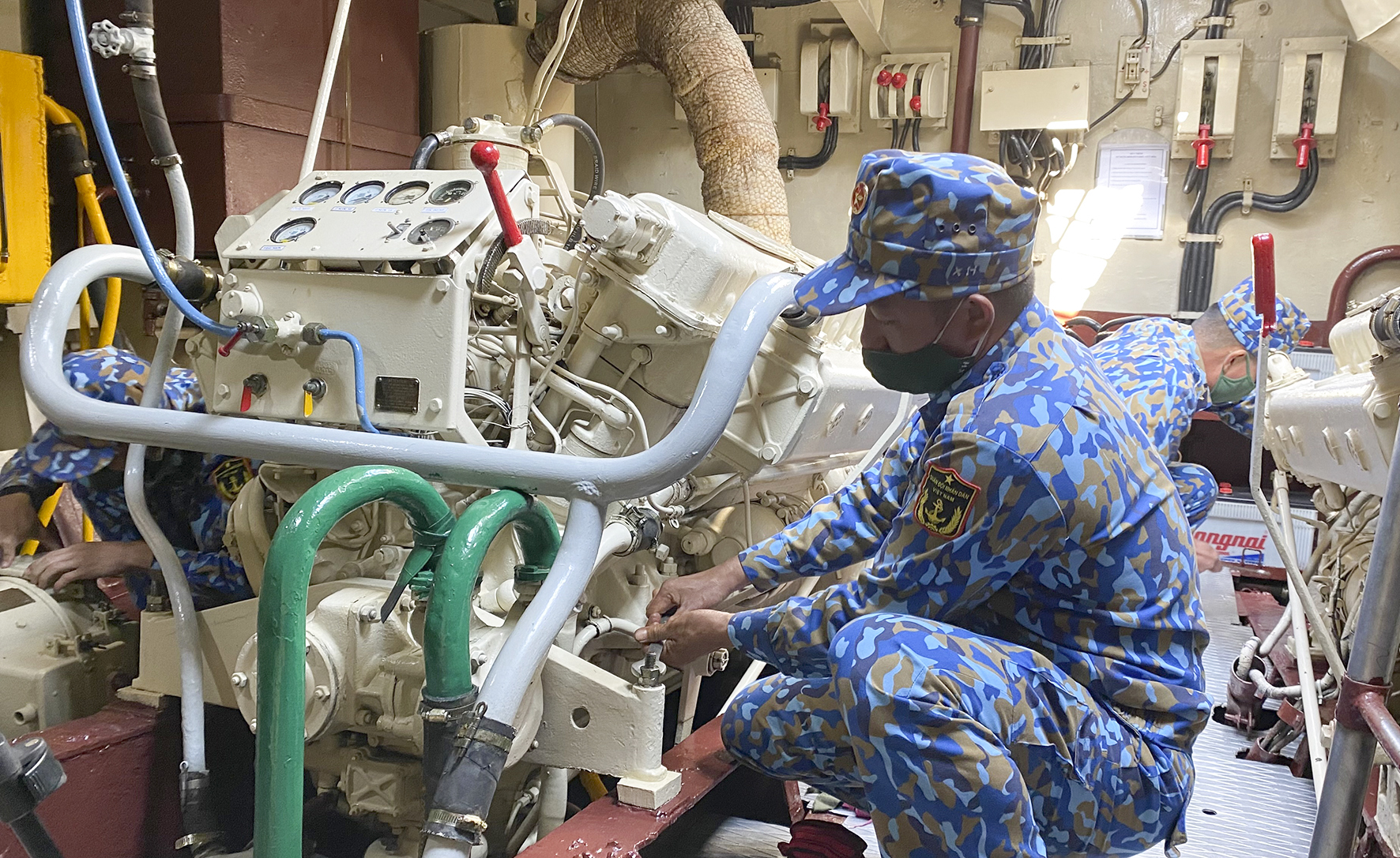 Trên từng boong tàu cho tới hầm máy và các bảng bố trí chiến đấu, theo sự phân công của người chỉ huy, cán bộ, thủy thủ chia nhau thành từng nhóm, từng tổ vẫn miệt mài cọ rỉ, tra dầu mỡ và hiệu chỉnh thông số kỹ thuật của VKTB. Vừa làm, họ vừa trao đổi truyền thụ kinh nghiệm để cùng nhau giữ cho tàu sạch, VKTB đồng bộ. Người có kinh nghiệm nhiều hướng dẫn tỉ mỉ và truyền đạt lại cho những người mới về tàu công tác từ thao tác giản đơn đến quy trình bảo quản, bảo dưỡng máy móc.