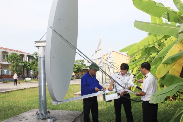 Cán bộ, nhân viên Trung tâm xử lý tin ra đa Hải quân kiểm tra hệ thống thông tin Visat tại đơn vị.