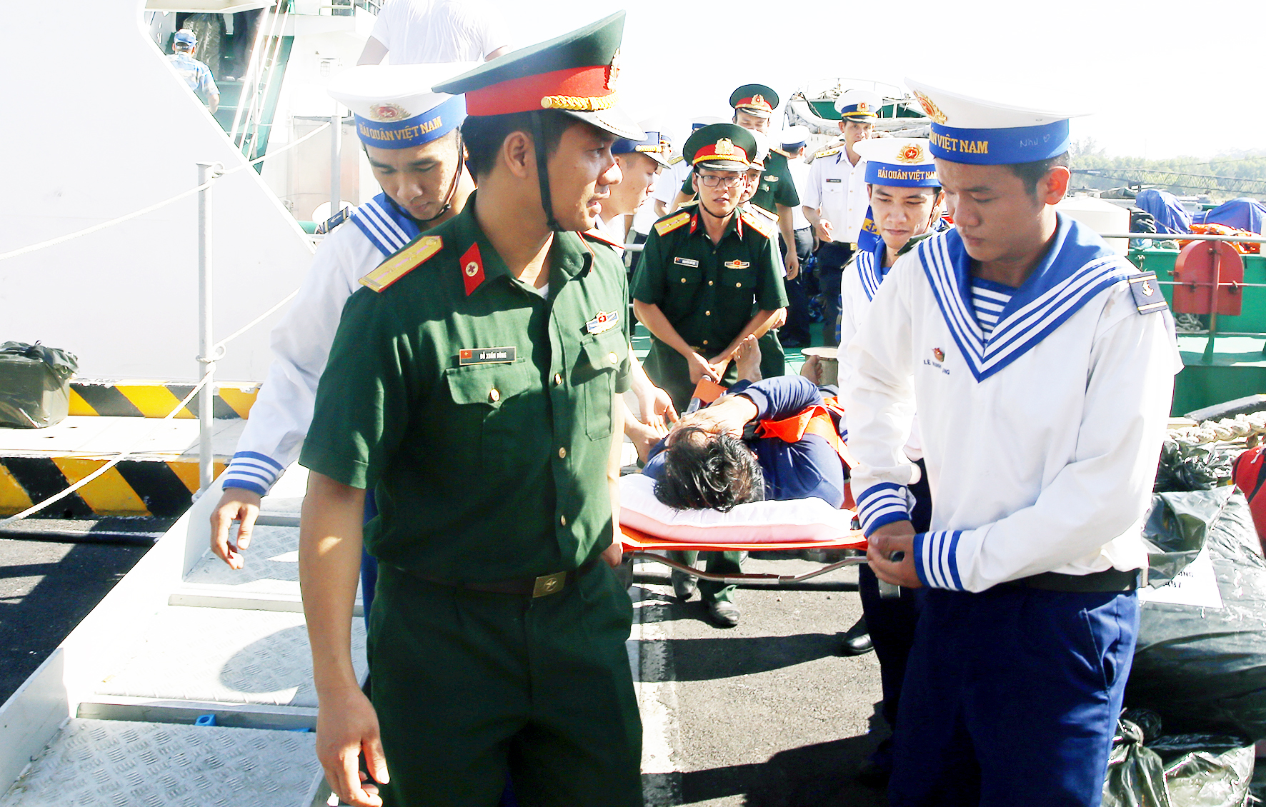Cán bộ, chiến sĩ Tàu 561 và quân y chuyển bệnh nhân Hoan lên bờ điều trị