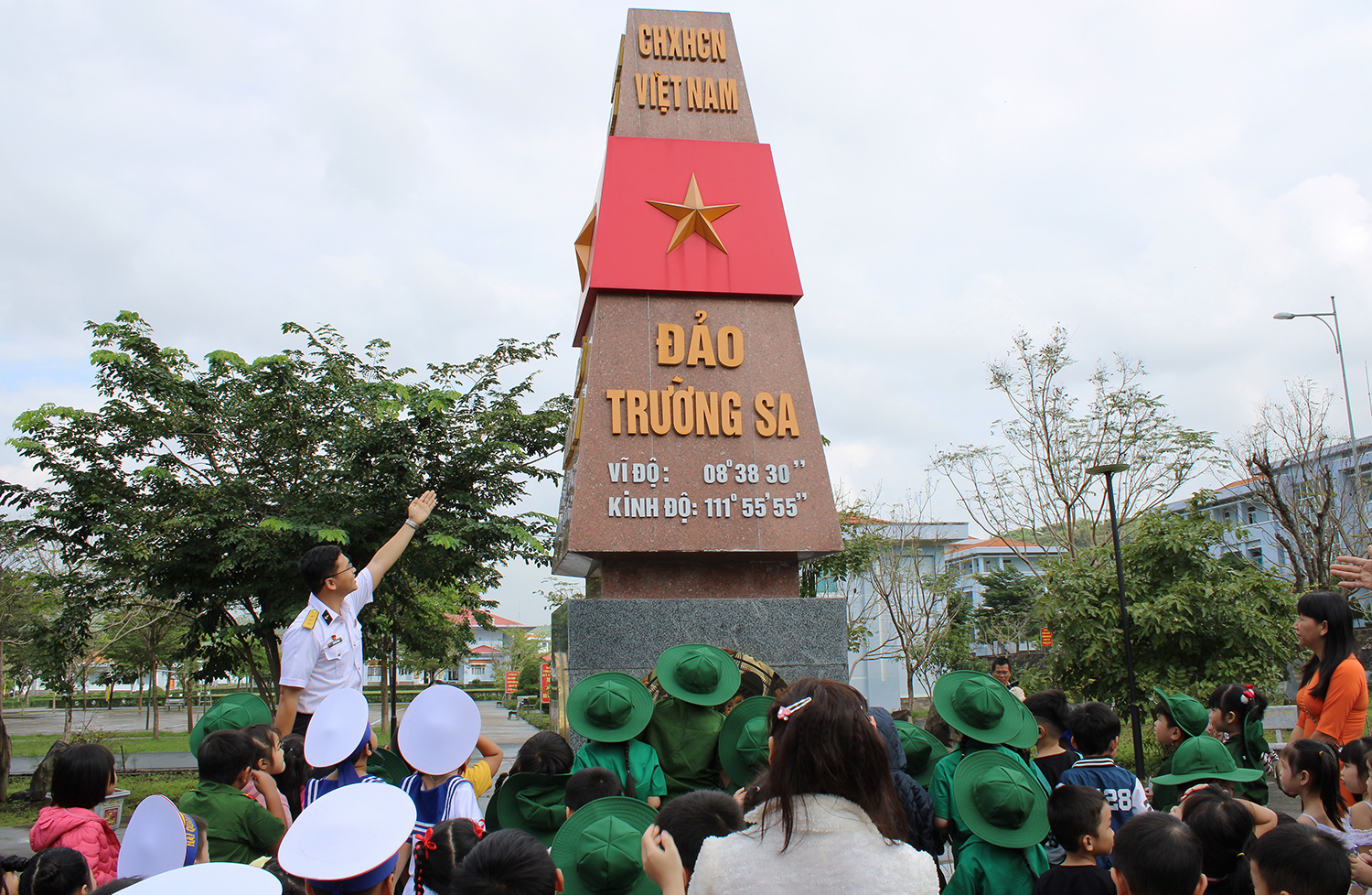Giáo viên, học sinh nghe giới thiệu về cột mốc chủ quyền Trường Sa