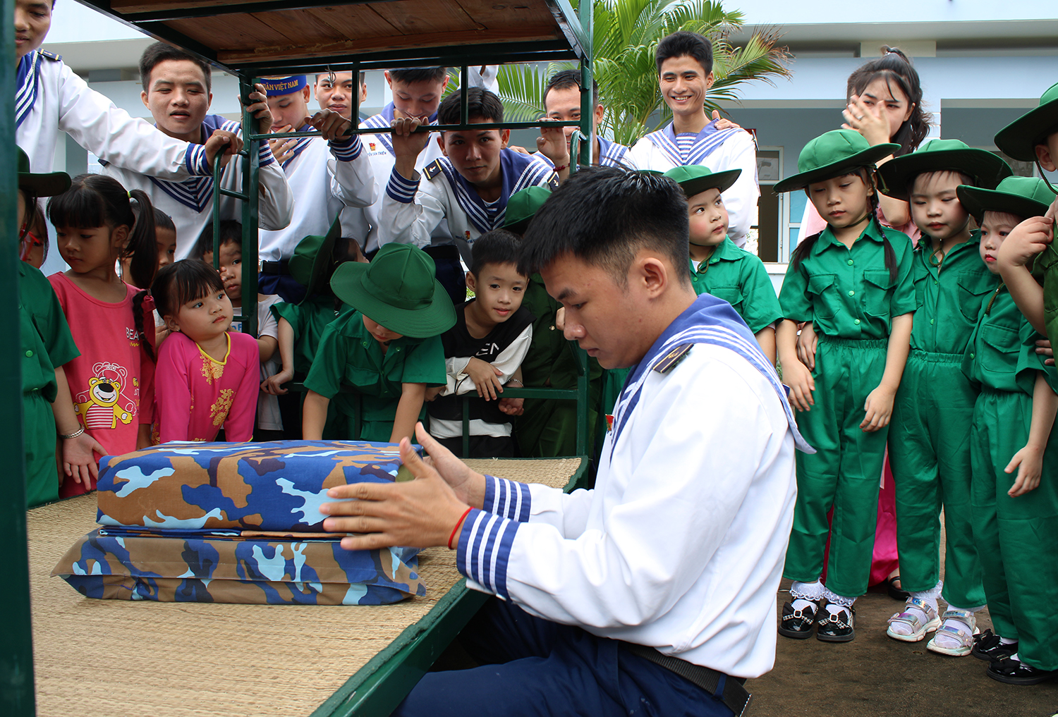 Chiến sĩ hướng dẫn các cháu học sinh cách gấp chăn màn
