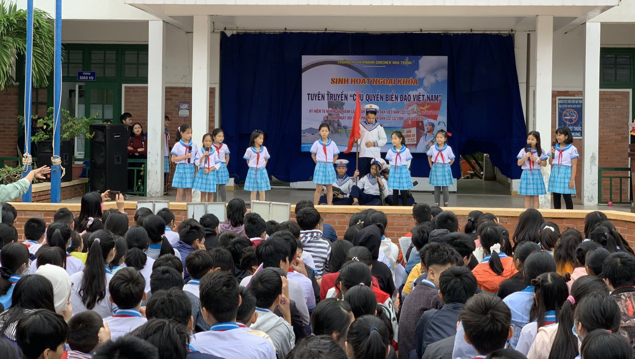 Sáng 21-12, tại TP. Nha Trang, tỉnh Khánh Hòa, Học viện Hải quân tổ chức thông tin tuyên truyền biển, đảo cho gần 3.000 giáo viên, học sinh Trường phổ thông Herman Gmeiner, Trưởng Tiểu học Vĩnh Nguyên 1, Trường Tiểu học Phương Sài Nha Trang.