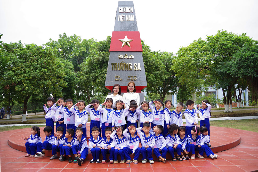 Chụp ảnh lưu niệm tại mô hình cột mốc chủ quyền đảo Trường Sa trong khuôn viên Lữ đoàn