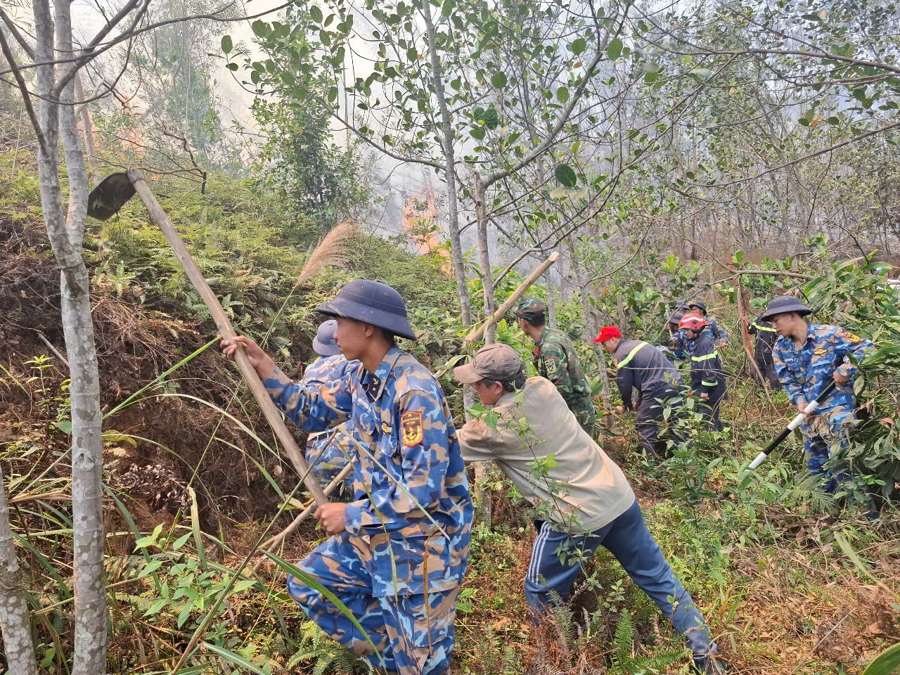 Do thời tiết khô hanh, địa hình núi dốc, đám cháy lớn đã gây khó khăn cho việc chữa cháy. Với ý chí quyết tâm cao, các lực lượng đã tiếp cận đám cháy, khẩn trương dập lửa; phát đường băng, tạo vành đai ngăn lửa cháy lan.