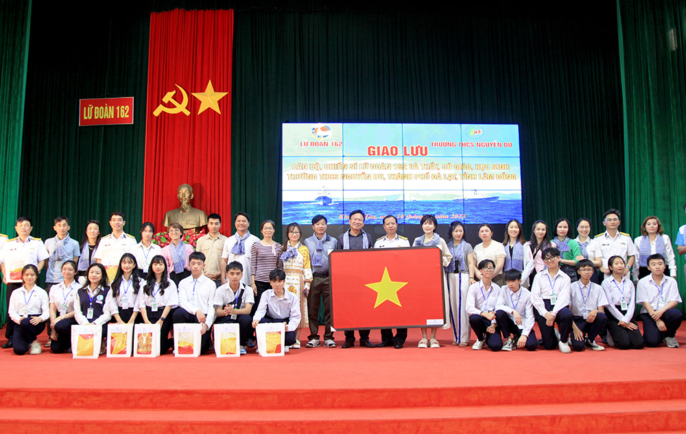 Giáo viên, học sinh Trường THCS Nguyễn Du tặng Lữ đoàn 162 cờ Tổ quốc