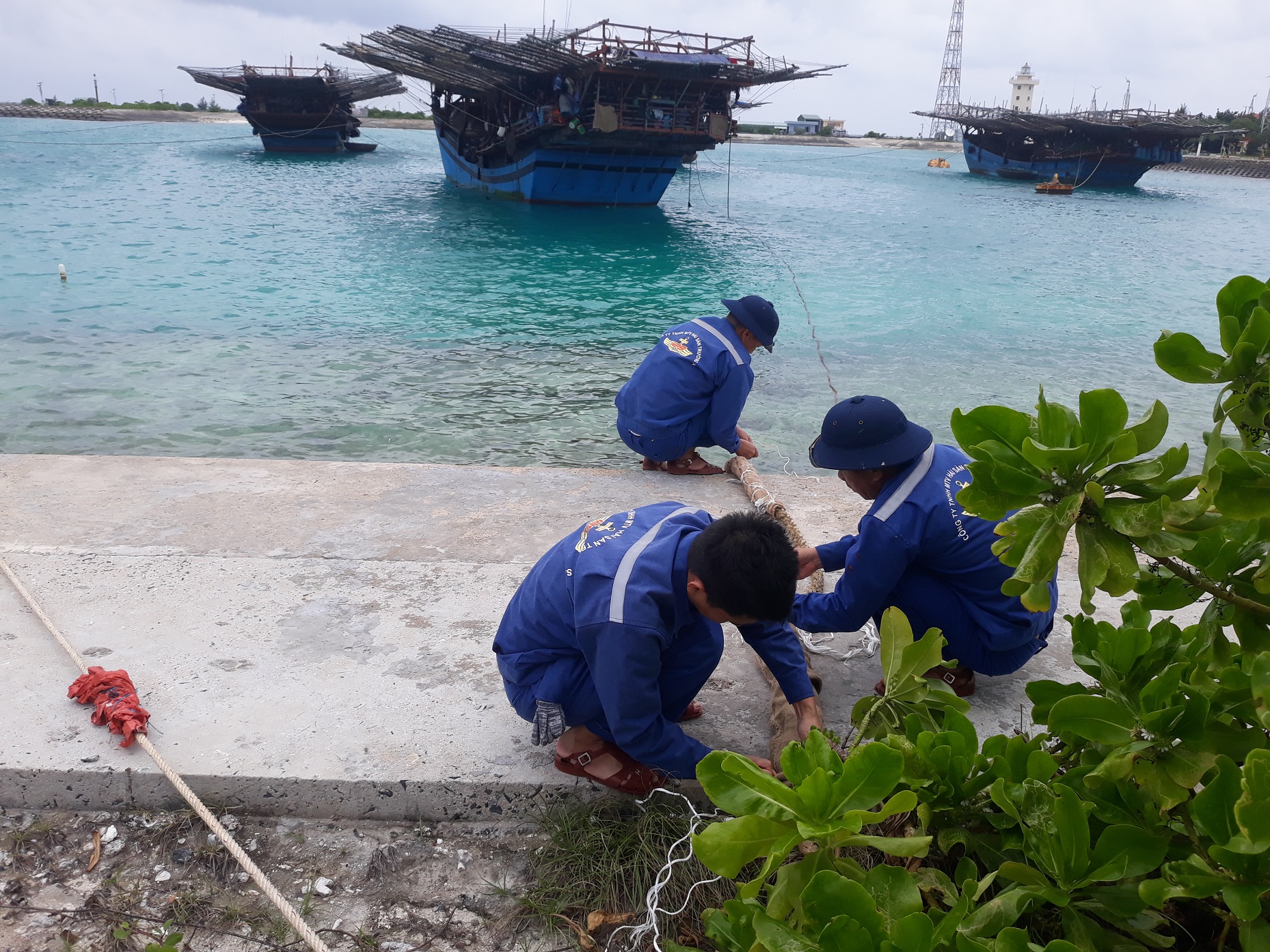 Cán bộ, nhân viên Trung tâm dịch vụ Hậu cần-Kỹ thuật đảo Sinh Tồn hỗ trợ ngư dân gia cố dây buộc tàu