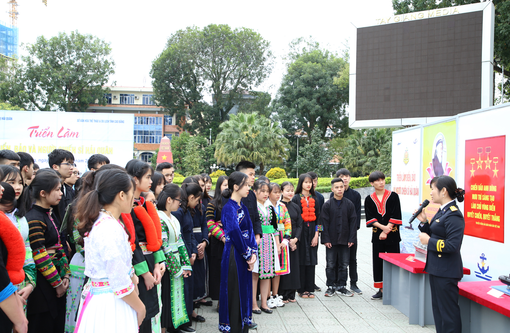 Học sinh Trường THPT Dân tộc nội trú tỉnh Cao Bằng xem triển lãm biển, đảo, người chiến sĩ Hải quân. Ảnh: Hải Hà