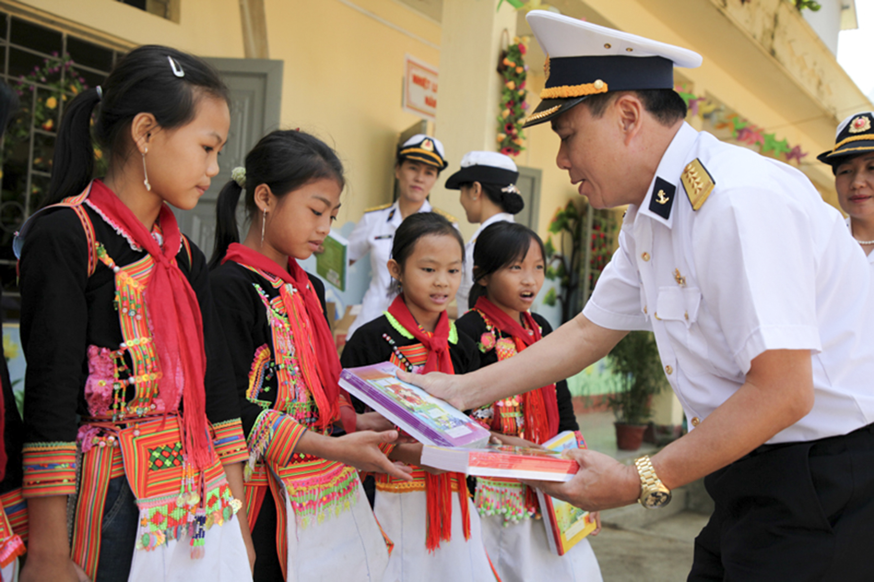 Đại diện Bộ Tham mưu Hải quân tặng quà học sinh nghèo dân tộc Dao huyện Sìn Hồ, tỉnh Lai Châu. Ảnh VOV