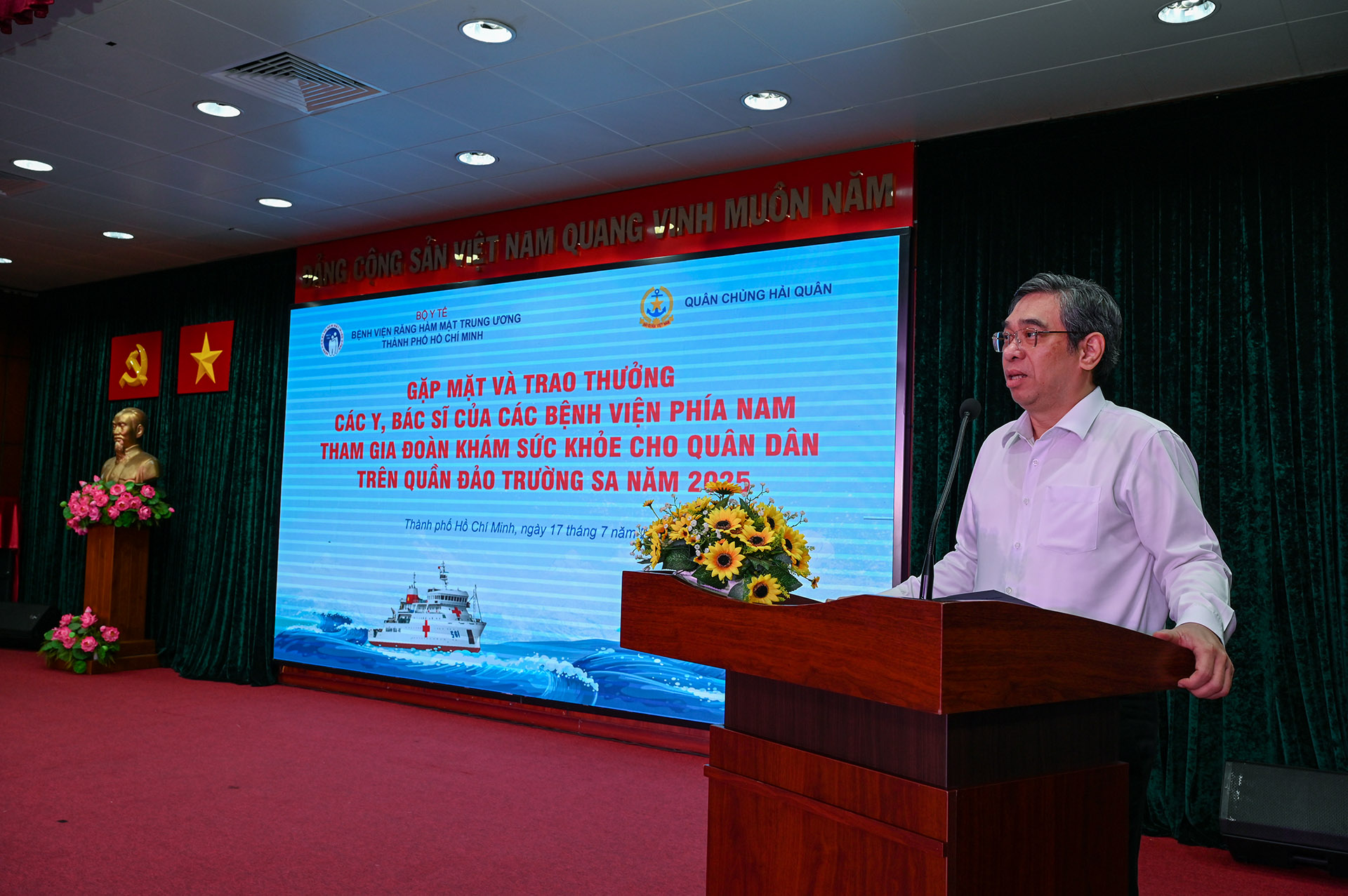 Chiều 17/7, tại TP. Hồ Chí Minh, Quân chủng Hải quân phối hợp với Bệnh viện Răng Hàm mặt Trung ương TP Hồ Chí Minh tổ chức buổi gặp mặt, tri ân và trao thưởng cho đội ngũ y, bác sĩ phía Nam đã tham gia đoàn khám sức khỏe cho quân dân trên đặc khu Trường Sa năm 2025.