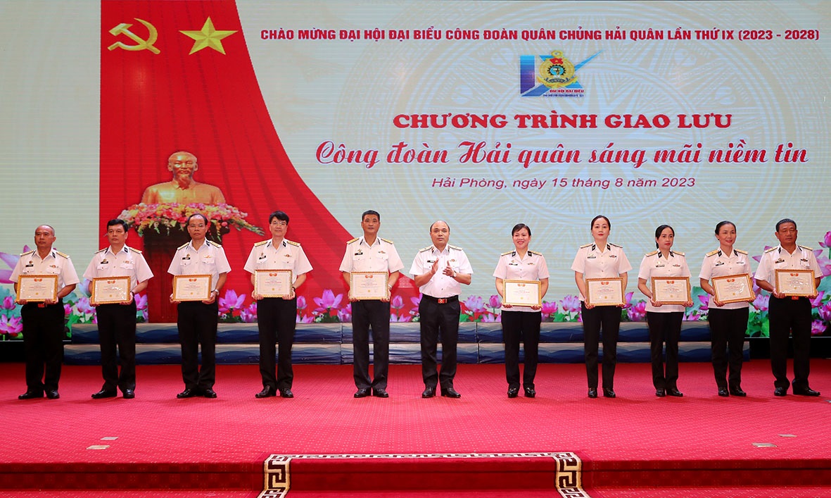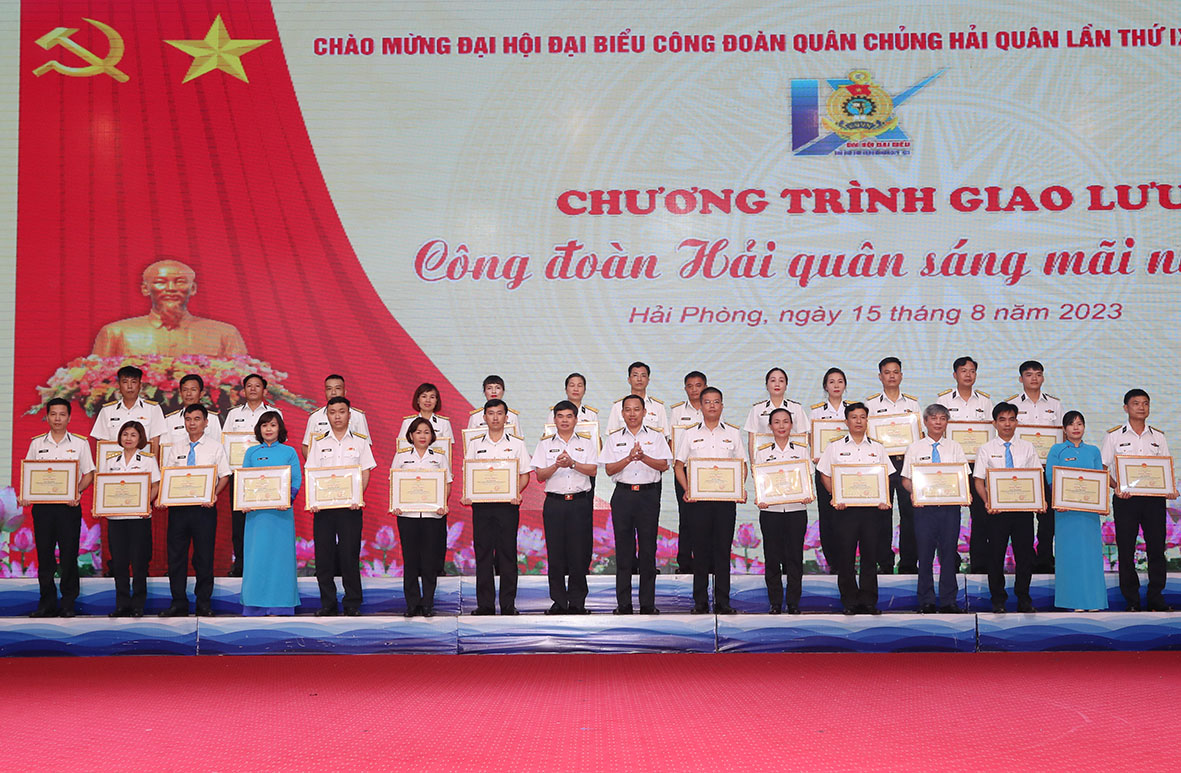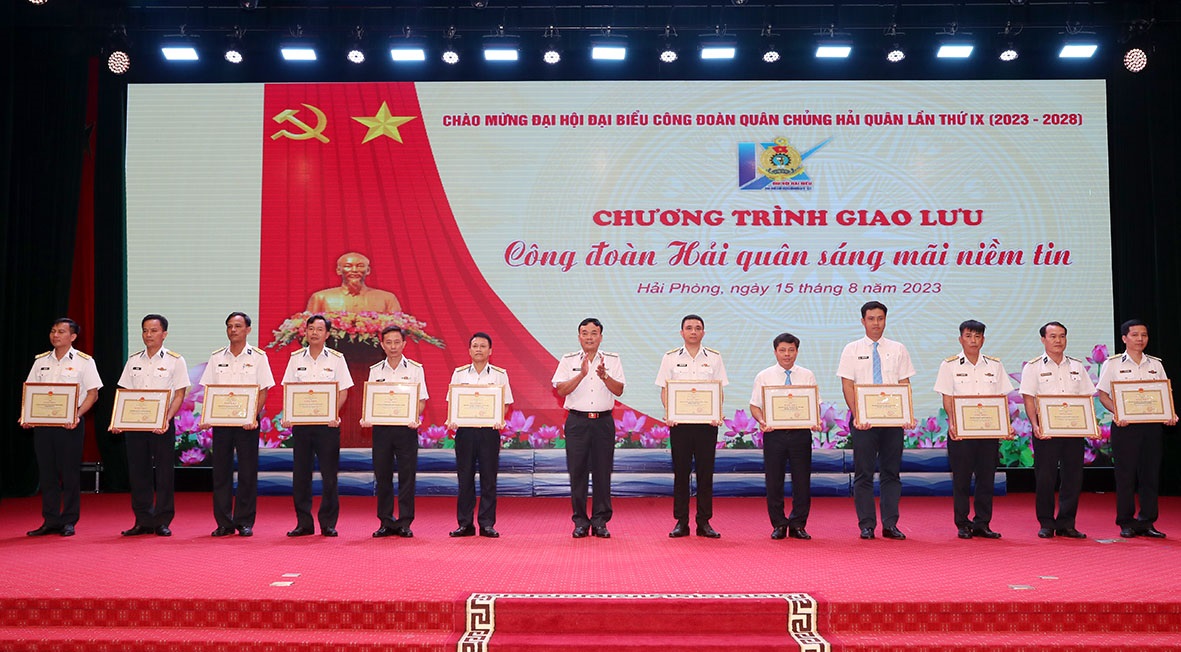 Tại buổi giao lưu, 13 đồng chí là lãnh đạo, cán bộ công đoàn Quân chủng Hải quân được Chủ tịch Tổng Liên đoàn Lao động Việt Nam tặng Kỷ niệm chương “Vì sự nghiệp xây dựng tổ chức Công đoàn”; Bộ Tư lệnh Hải quân tặng Bằng khen cho 12 tập thể, 28 cá nhân có thành tích tiêu biểu xuất sắc trong phong trào công nhân và hoạt động công đoàn giai đoạn 2018-2023.