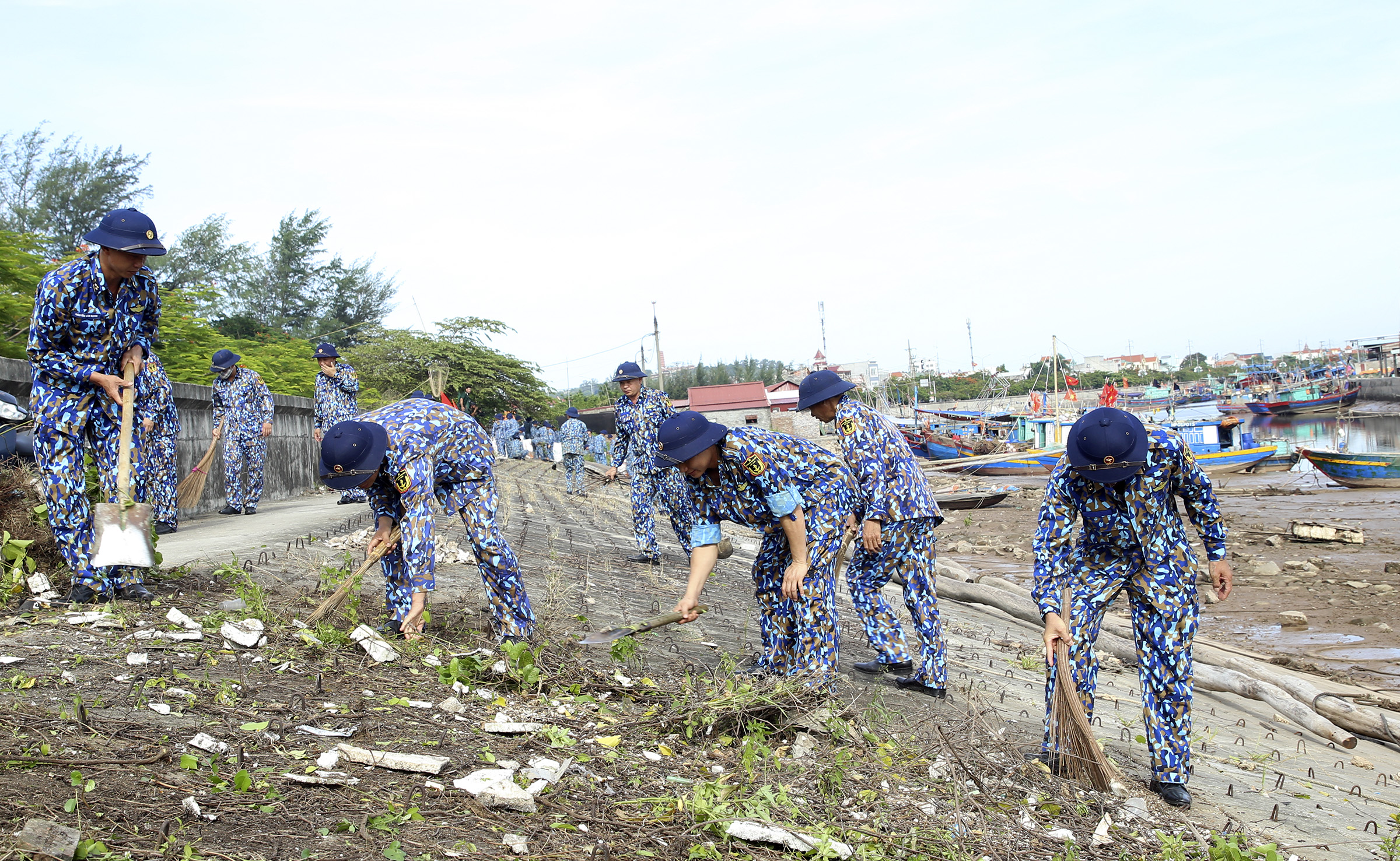 Bộ đội Vùng 1 Hải quân dọn vệ sinh khu vực cảng cá Ngọc Hải, Đồ Sơn, Hải Phòng. Ảnh: Vũ Hưởng