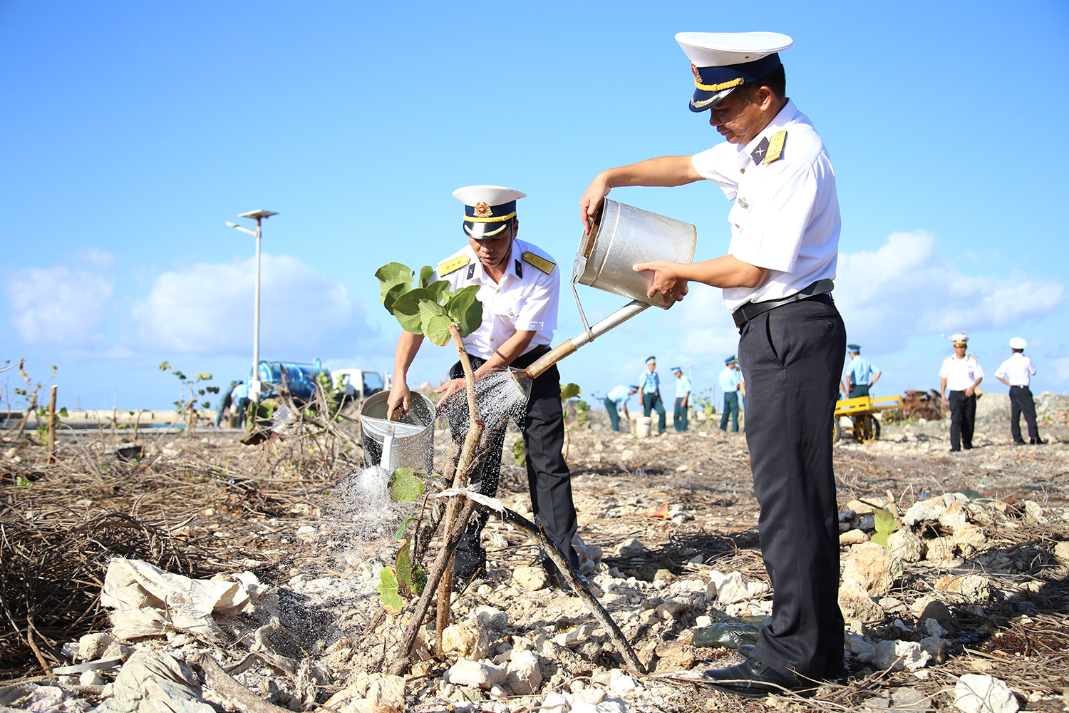 Chăm sóc cây xanh ở đảo Trường Sa. Ảnh: Bùi Tùng