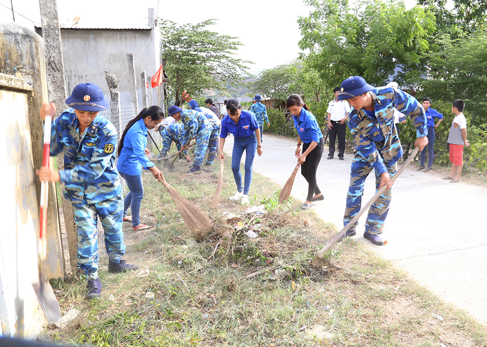Cán bộ chiến sĩ Lữ đoàn 957 Vùng 4 cùng đoàn thanh niên địa phương làm vệ sinh môi trường tại xã Cam thịnh Tây, TP.Cam Ranh