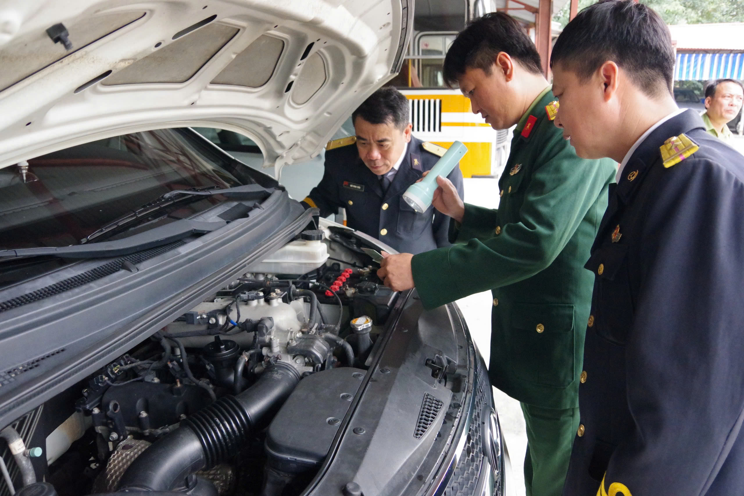 Đoàn kiểm định kỹ thuật của Quân khu 3 kiểm tra xe ô tô tại Lữ đoàn 602, Bộ Tham mưu Hải quân. Ảnh: TTV