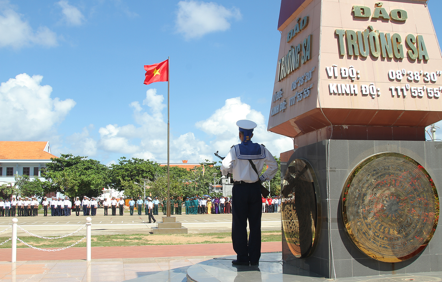 Các đoàn công tác đến thị trấn Trường Sa vinh dự và tự hào được thực hiện nghi lễ chào cờ
