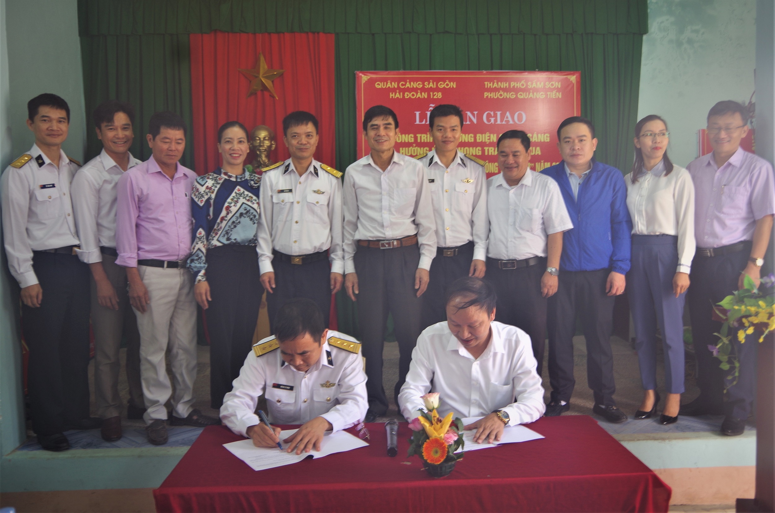 Thực hiện Cuộc vận động “Cả nước chung sức xây dựng nông thôn mới, đô thị văn minh” và phong trào thi đua “Cả nước chung tay vì người nghèo, không để ai bị bỏ lại phía sau”, Hải đoàn 128 đã hỗ trợ địa phương kinh phí mua sắm các thiết bị điện chiếu sáng với số tiền 80 triệu đồng từ nguồn đóng góp của cán bộ, nhân viên, người lao động trong đơn vị.