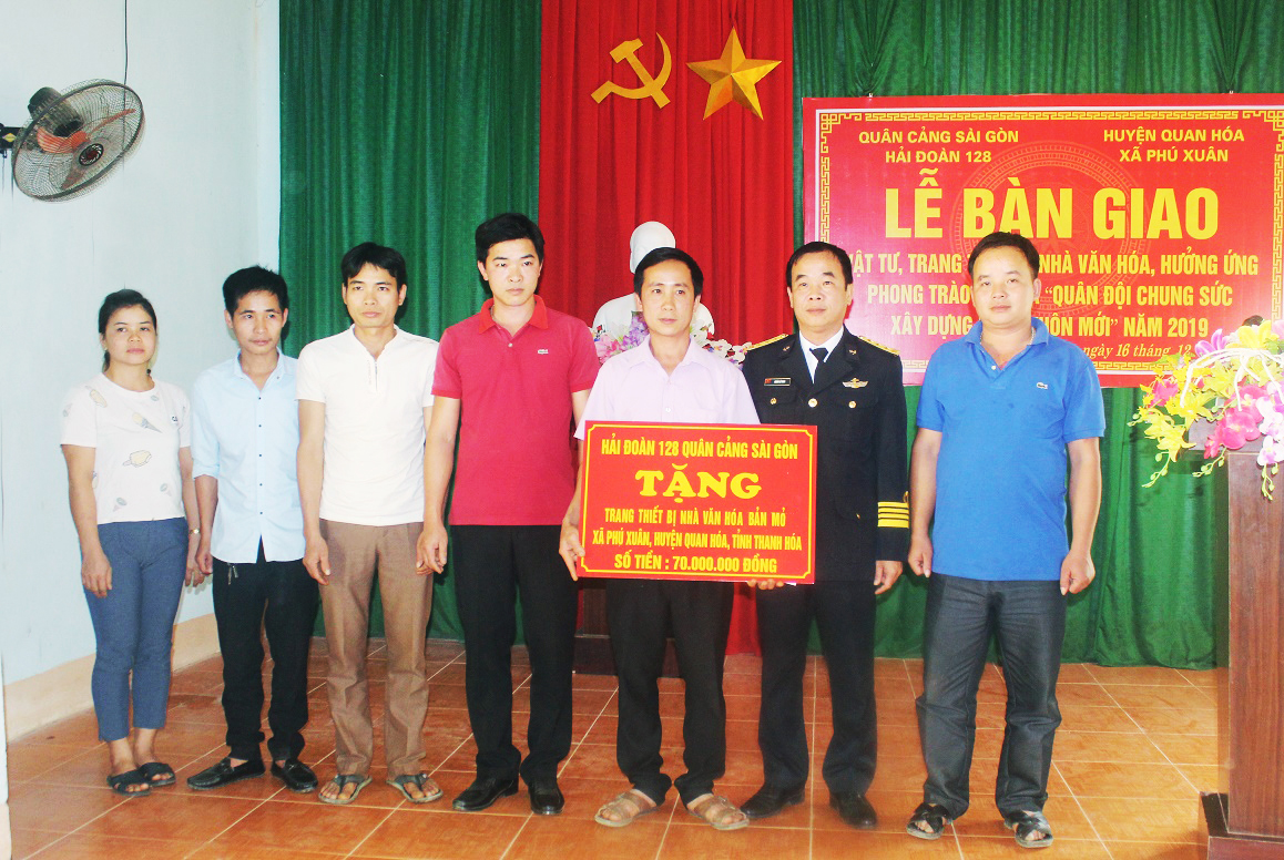 Ngày 16 và 17-12, Hải đoàn 128, Quân cảng Sài Gòn phối hợp với chính quyền địa phương xã Phú Xuân, huyện Quan Hóa, tỉnh Thanh Hóa tổ chức Lễ bàn giao vật tư, trang thiết bị Nhà văn hóa cho thôn bản Mỏ, xã Phú Xuân.