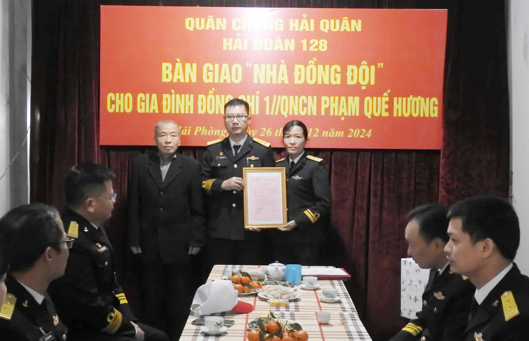 Ngày 27/12, tại Hải Phòng, Hải đoàn 128 đã tổ chức bàn giao nhà đồng đội tặng gia đình Thiếu tá QNCN Phạm Quế Hương, Nhân viên Phòng kỹ thuật. Thượng tá Lâm Quốc Tuấn, Phó Hải đoàn trưởng chủ trì buổi bàn giao.