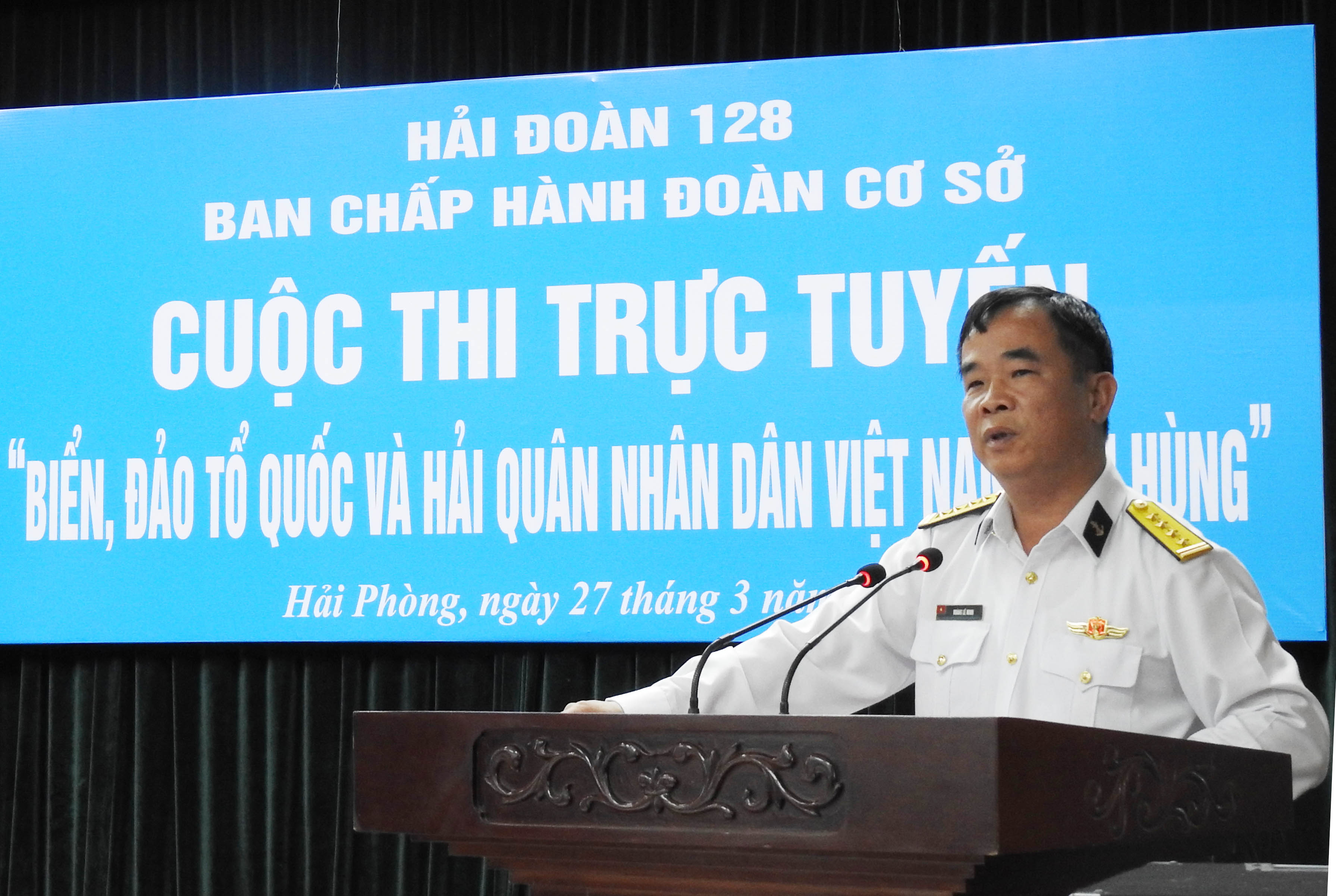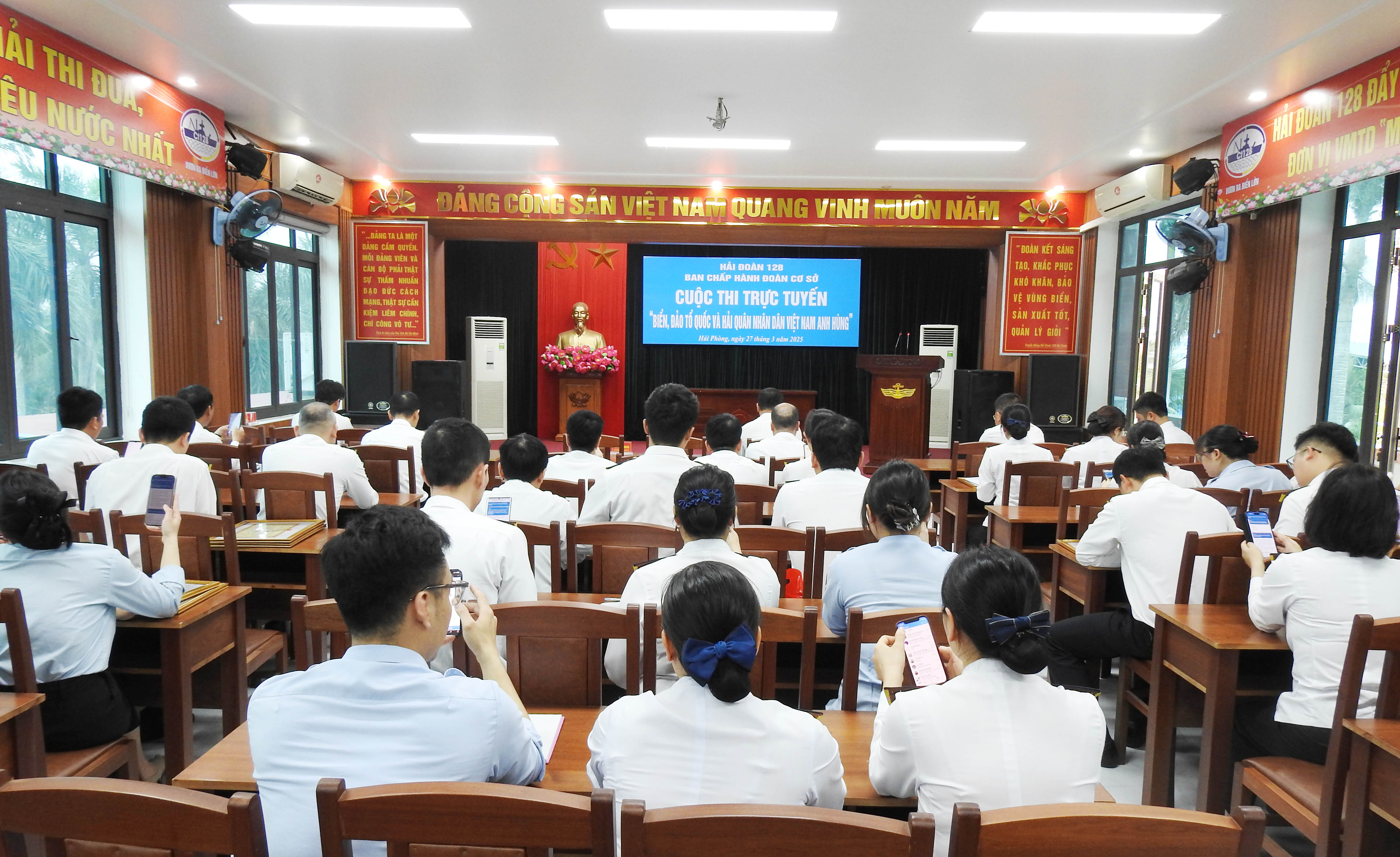 Hướng tới kỷ niệm 70 năm Ngày thành lập Hải quân nhân dân Việt Nam, sáng 27/3, tại Hải Phòng, Đoàn cơ sở Hải đoàn 128 tổ chức tham gia Cuộc thi trực tuyến “Biển đảo Tổ quốc và Hải quân nhân dân Việt Nam anh hùng”. Đại tá Hoàng Lê Minh, Bí thư Đảng ủy Hải đoàn, Chủ tịch Công ty 128 dự, chỉ đạo.