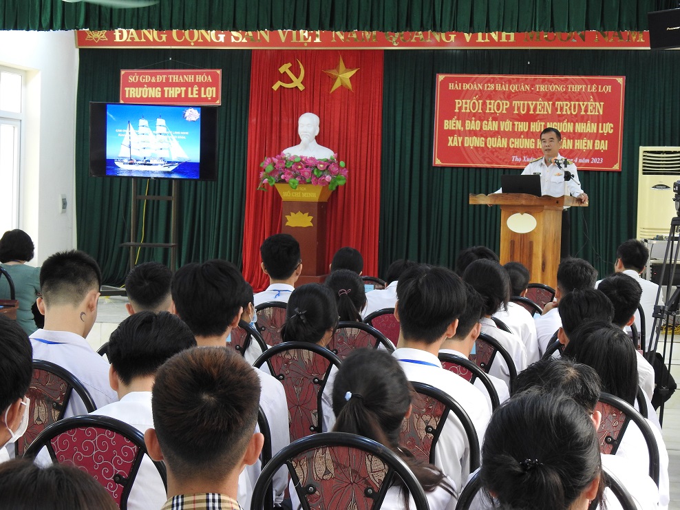 Ngày 6/4, tại Trường THPT Lê Lợi (huyện Thọ Xuân) và Trường THPT Nông Cống 1 (huyện Nông Cống), Hải đoàn 128 Hải quân phối hợp với Ban Tuyên giáo Tỉnh ủy Thanh Hóa tổ chức thông tin về biển, đảo gắn với tuyên truyền thu hút nguồn nhân lực xây dựng Quân chủng Hải quân hiện đại. Hơn 250 giáo viên và học sinh tham dự.