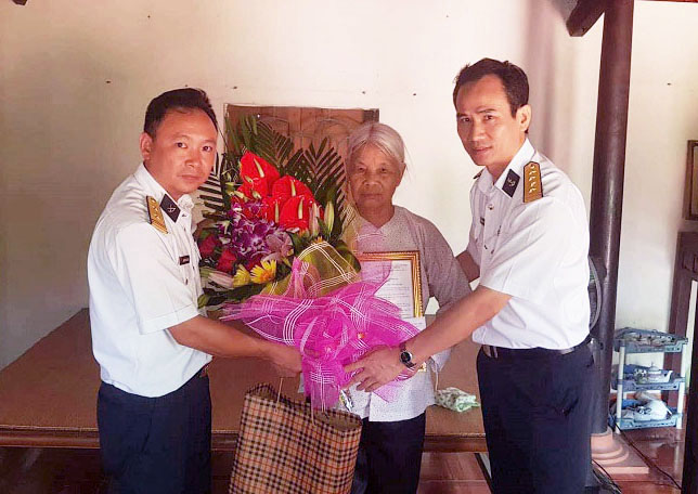Bà Đặng Thị Tám do sức khỏe yếu không dự buổi lễ, thủ trưởng Hải đoàn 128 đã đến nhà thăm hỏi và trao Quyết định phụng dưỡng