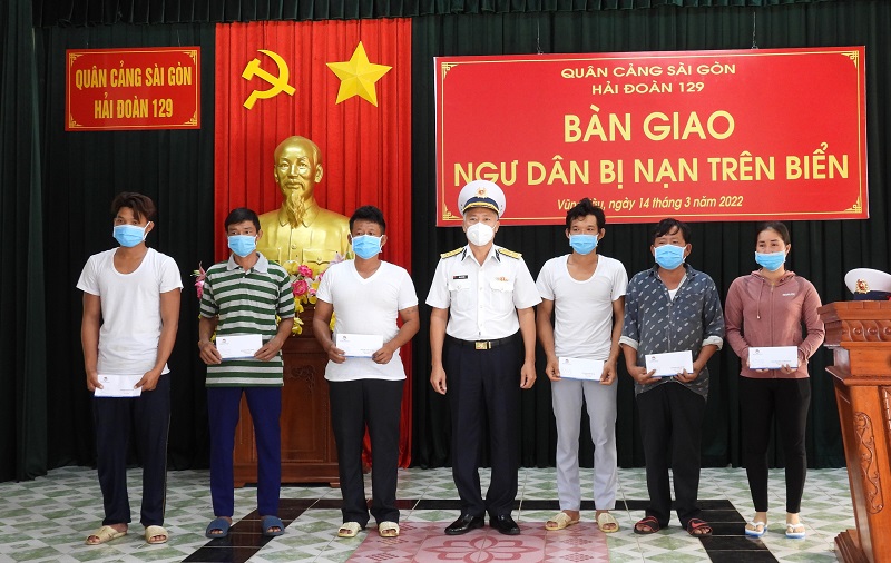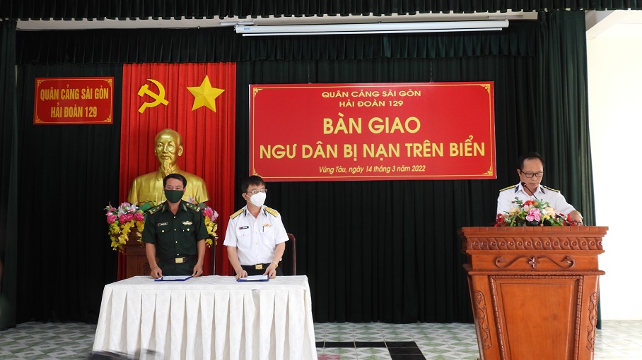 Sáng 14/3, Hải đoàn 129 thuộc Tổng công ty Tân cảng Sài Gòn đã tổ chức bàn giao 6 ngư dân và thi thể ông Huỳnh Văn Hồng cho lực lượng biên phòng tỉnh Bà Rịa-Vũng Tàu và gia đình theo đúng thủ tục quy định.