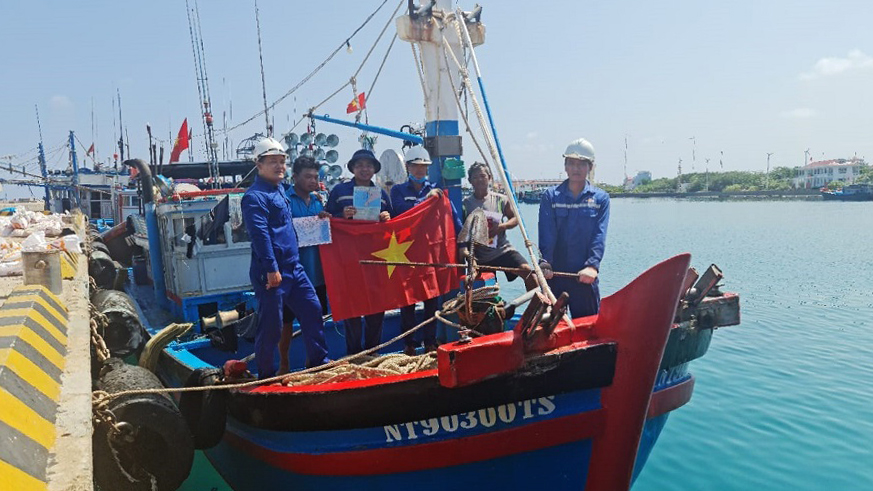 Cán bộ, nhân viên Trung tâm Dịch vụ hậu cần-kỹ thuật đảo Trường Sa tặng ngư dân tàu cá NT 90300 TS cờ Tổ quốc