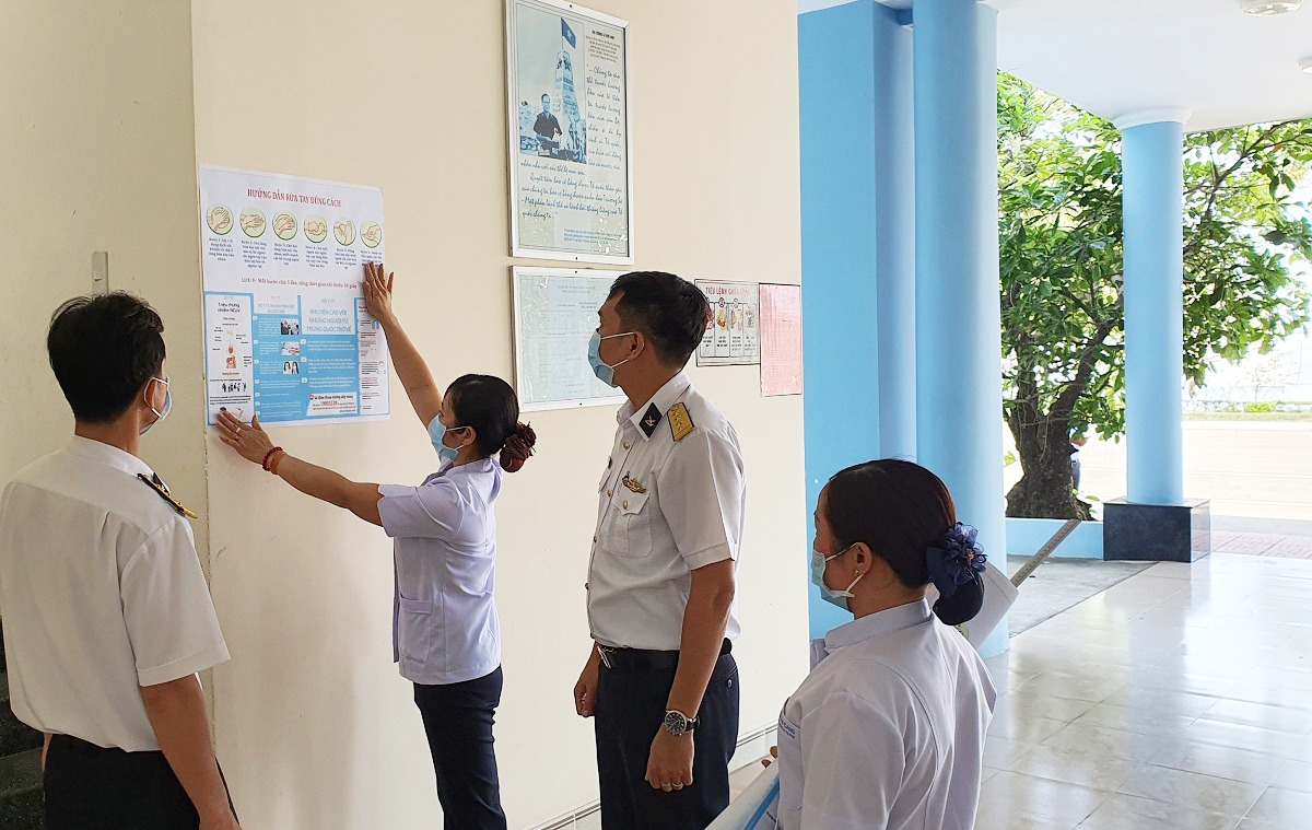 Cũng trong ngày, quân y Hải đoàn đã tổ chức dán các pa no, khẩu hiệu tuyên truyền phòng, chống dịch bệnh viêm đường hô hấp cấp do chủng mới của virus Corona gây ra.