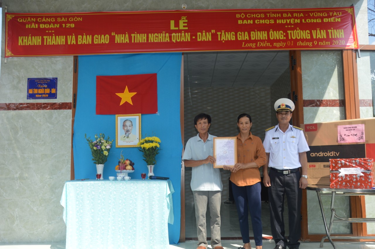 Trước đó, ngày 1-9, tại Bà Rịa-Vũng Tàu, Hải đoàn 129 đã phối hợp với Ban chỉ huy quân sự huyện Long Điền tổ chức khành thành và bàn giao "Nhà tình nghĩa quân-dân" cho gia đình ông Tưởng Văn Tình, sinh năm 1968, trú tại Ấp Phước Hưng, xã Tam Phước, huyện Long Điền, tỉnh Bà Rịa-Vũng Tàu với tổng số tiền hỗ trợ 80 triệu đồng. Đây là số tiền do cán bộ, nhân viên Hải đoàn 129 quyên góp.