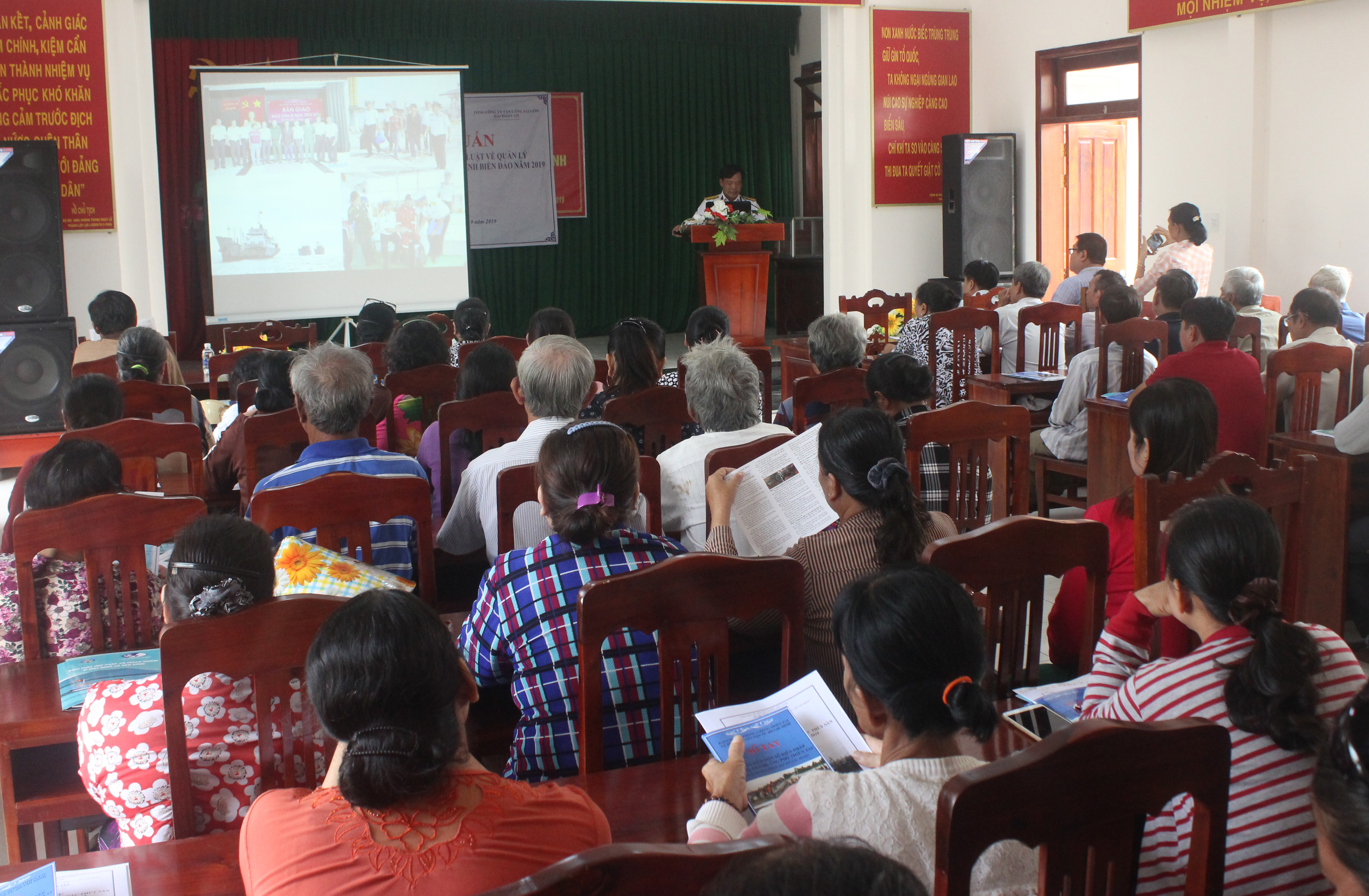 Báo cáo viên cũng đã tuyên truyền về âu tàu, làng chài trên huyện đảo Trường Sa, tỉnh Khánh Hòa-địa chỉ tin cậy giúp cho bà con ngư dân vươn khơi bám biển, phát triển kinh tế bền vững. Ban tổ chức đã phát tờ rơi về âu tàu, làng chài, tài liệu tập huấn và sổ tay phòng, tránh, ứng phó với thiên tai cho bà con ngư dân tại buổi tập huấn…