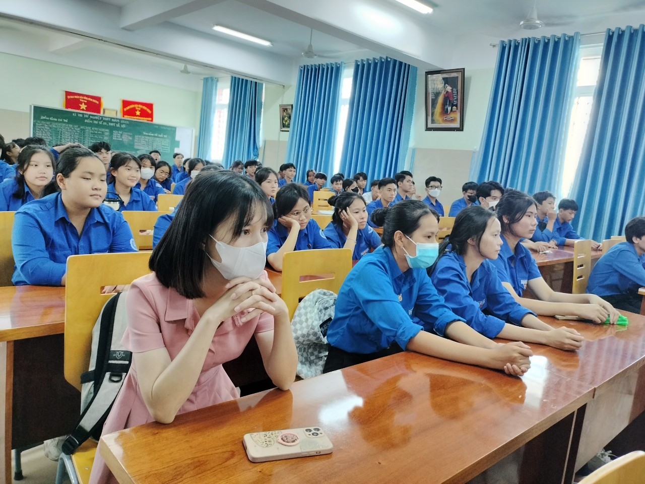 Báo báo viên Hải đoàn cũng đã giới thiệu về các cơ sở đào tạo của Quân chủng Hải quân và định hướng đăng ký dự tuyển vào Học viện Hải quân cho học sinh khối lớp 12 của huyện.