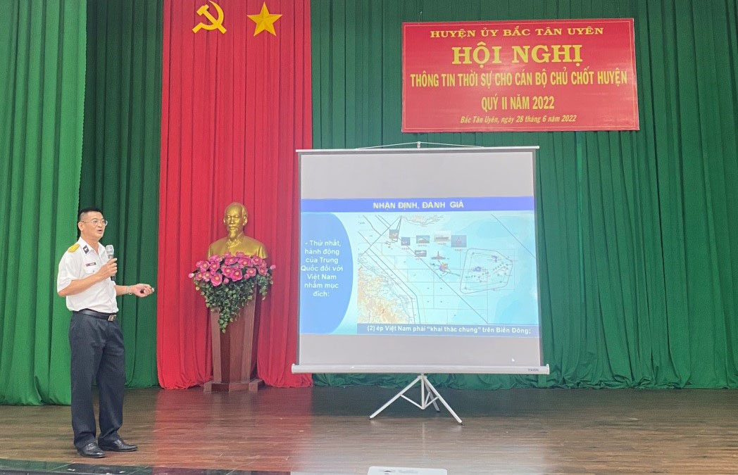 Chiều 28/6, Hải đoàn 129 Hải quân phối hợp với Huyện ủy Bắc Tân Uyên, tỉnh Bình Dương tổ chức thông tin về biển, đảo cho 240 cán bộ chủ chốt của huyện.