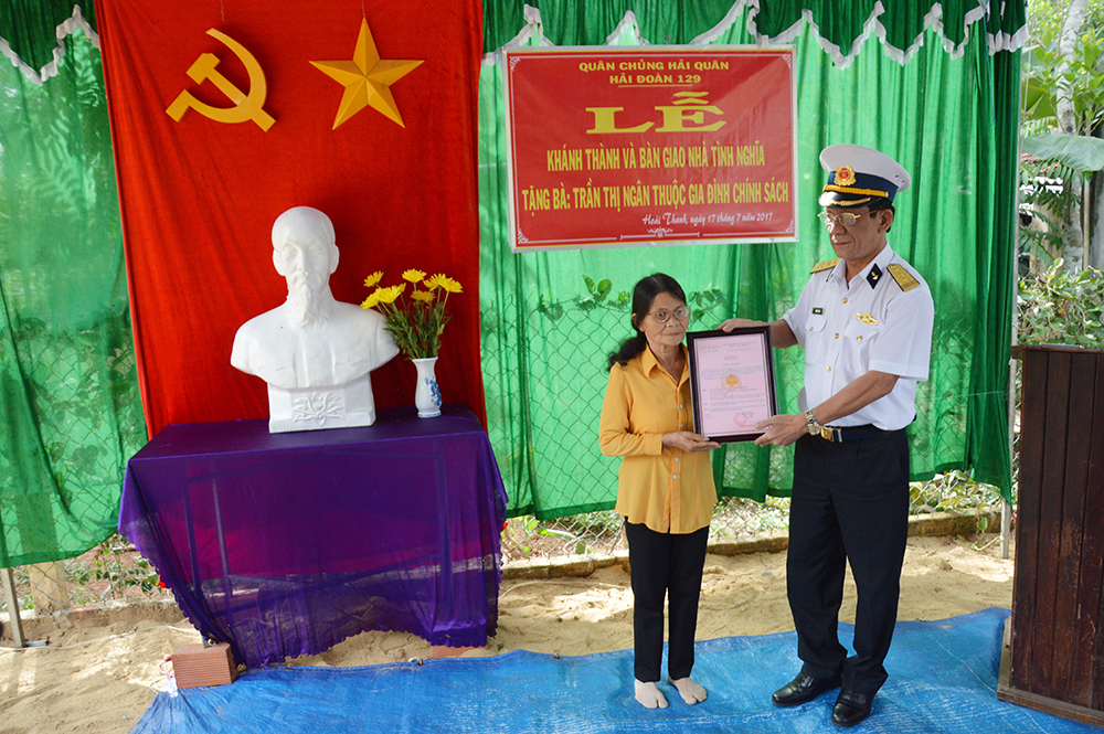 Chiều17-7, tại Bình Định, Hải đoàn 129 Hải quân phối hợp với Ban Ban Tuyên giáo Tỉnh ủy Bình Định, UBND huyện Hòa Nhơn và Đảng ủy, UBND xã Hoài Thanh tổ chức khánh thành, trao nhà tình nghĩa tặng bà Trần Thị Ngân ở thôn An Lộc 2, xã Hoài Thanh.